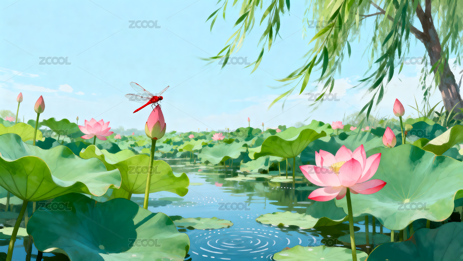 荷花,荷塘,荷叶,柳树,蝉,夏日,池塘,水面,荷花苞,夏天