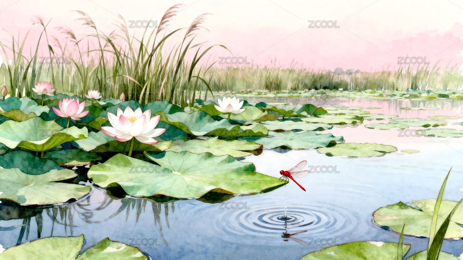 荷塘荷花插画