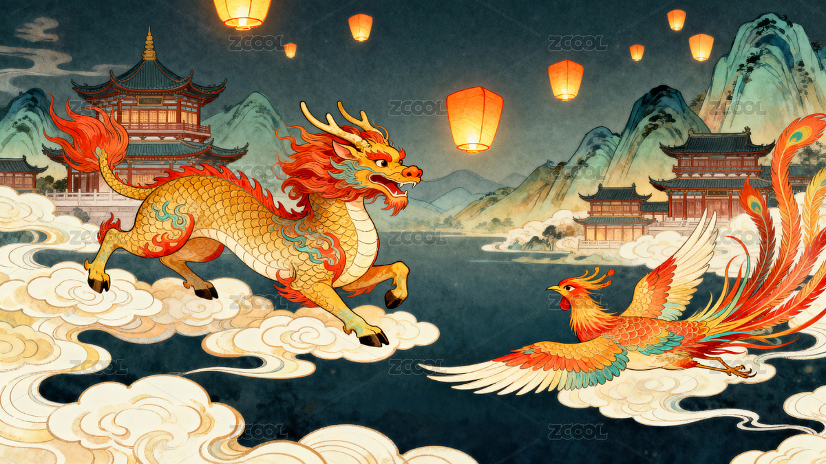色彩,传统,古建筑,灯笼,河流,天空,火焰,夜空,山峦,东方
