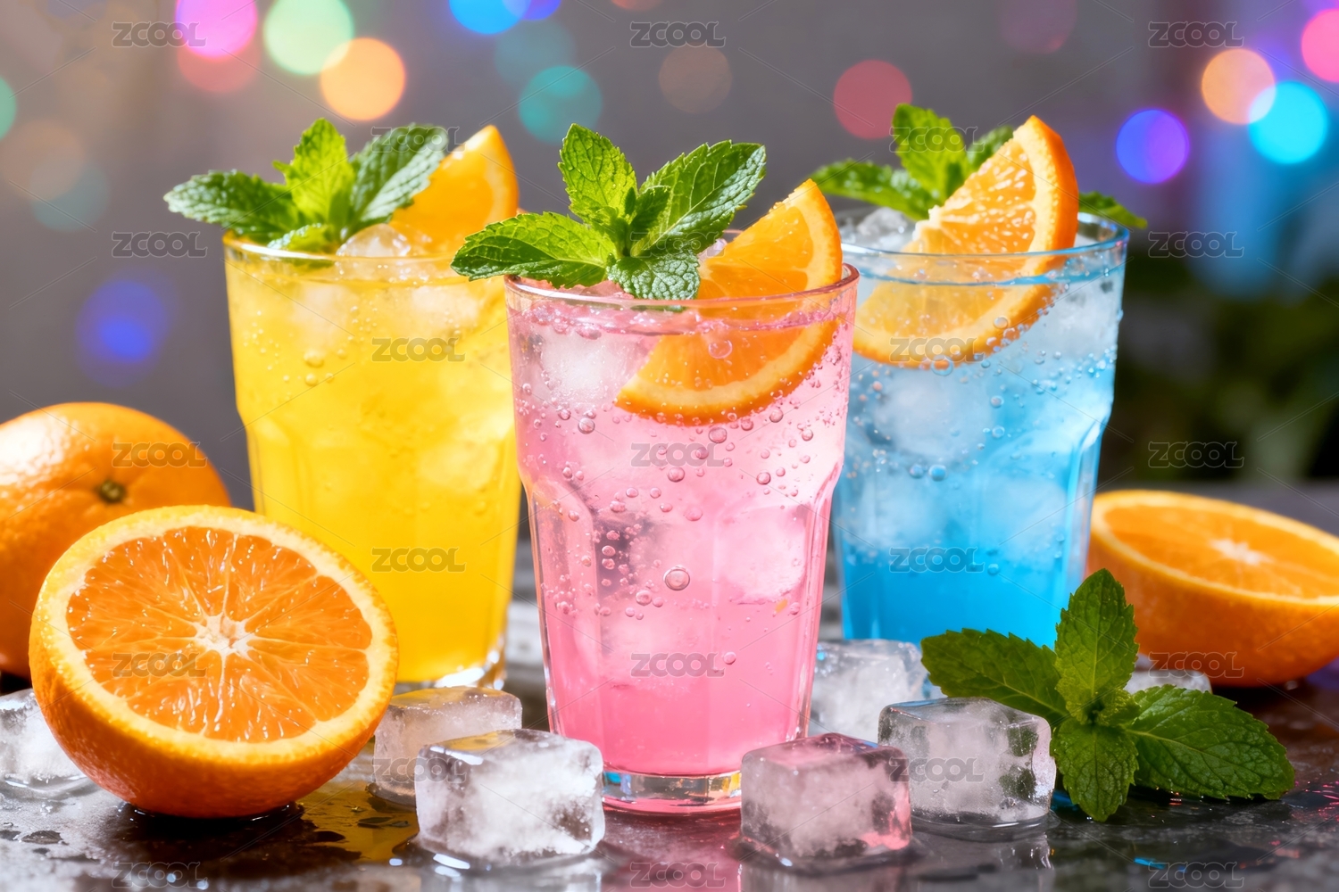 三杯色彩鲜艳的鸡尾酒配以水果装饰