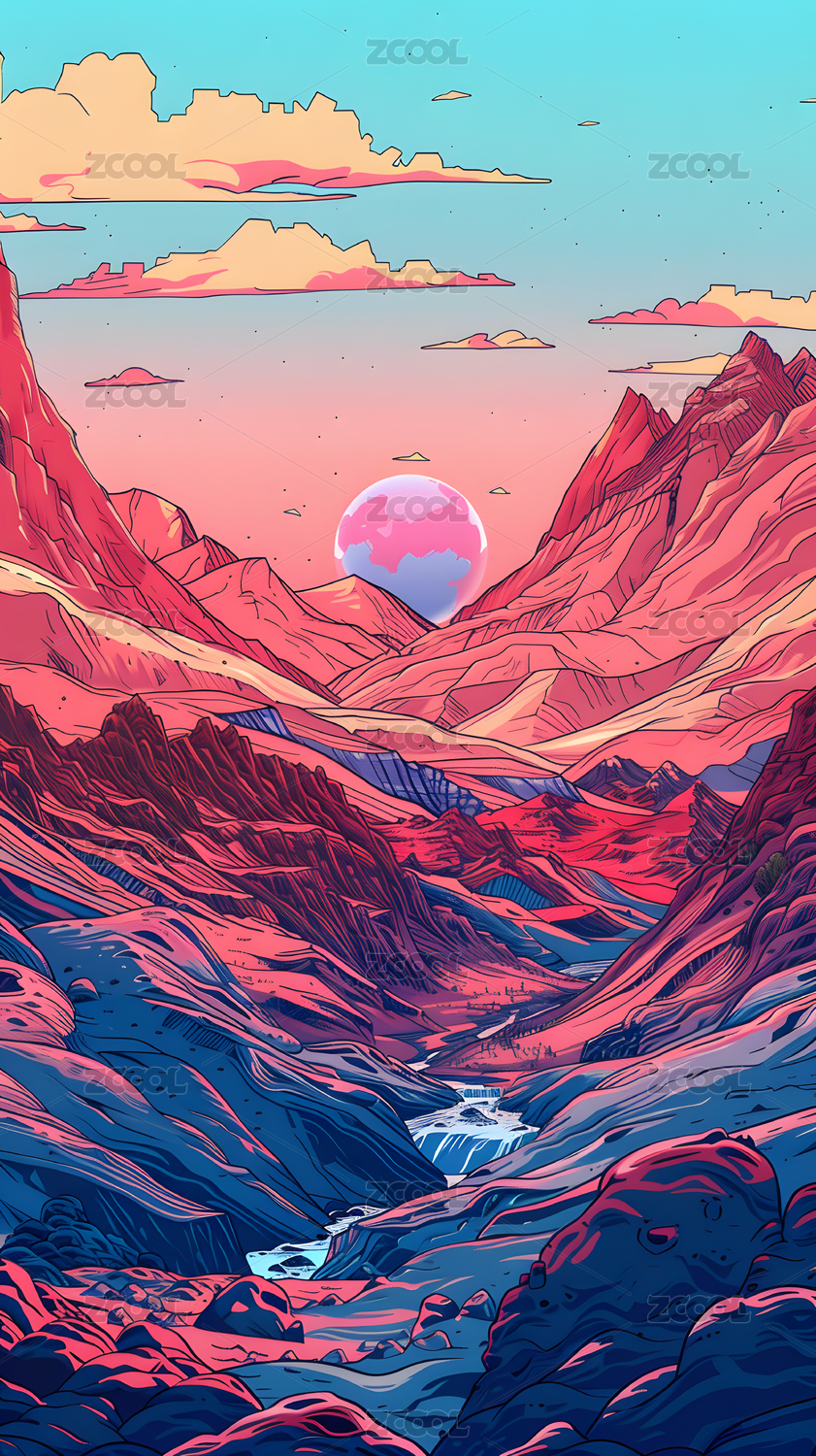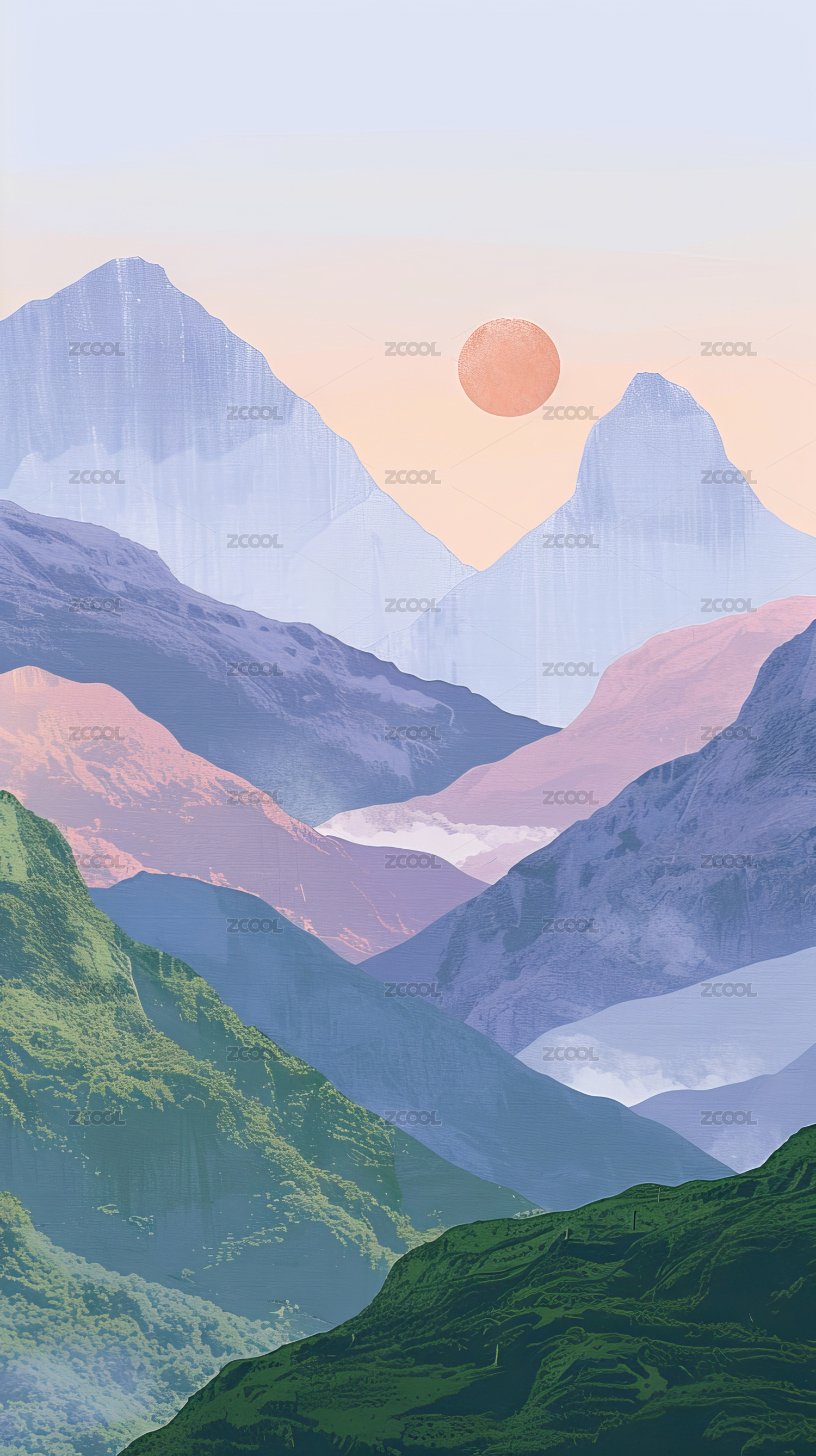 山和湖风景插画抽象艺术装饰画手机端海背景