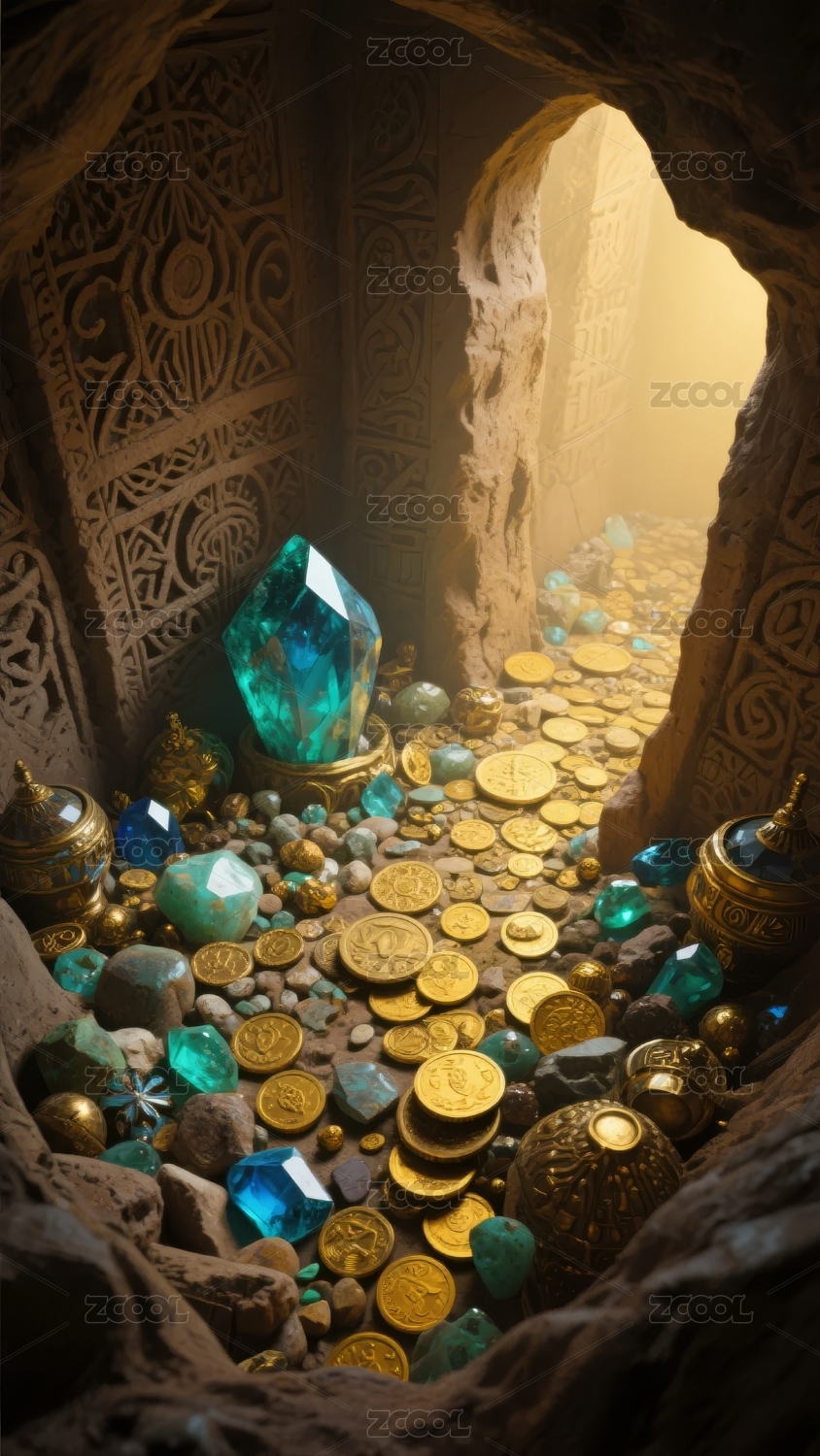 神秘洞穴内堆满宝石与金币的宝藏场景
