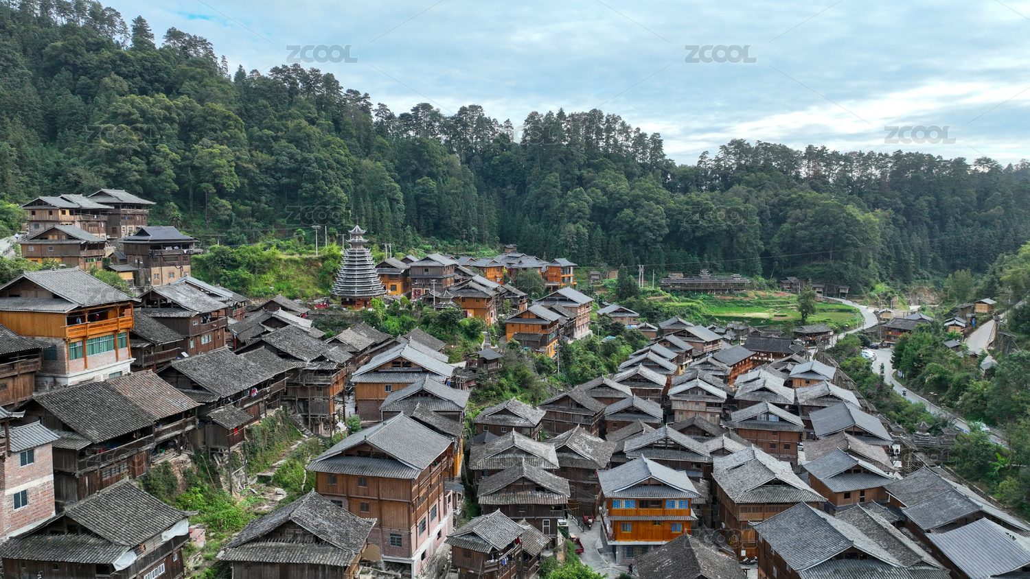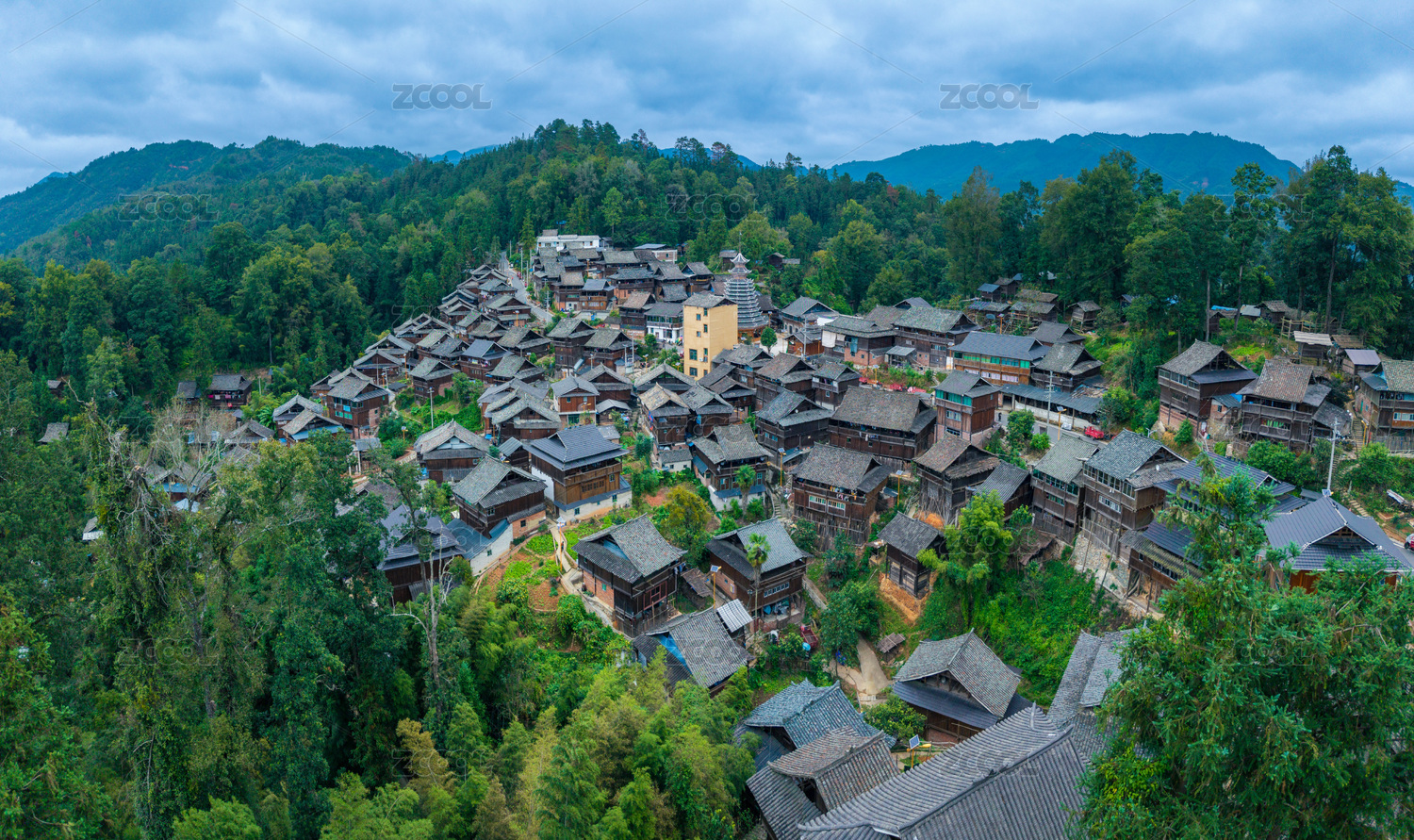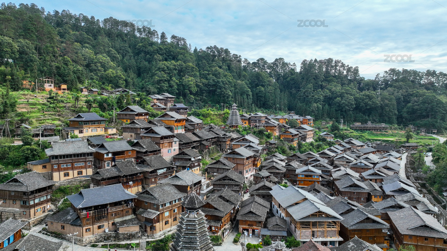 吊脚楼,航拍,全景,贵州,苗族村寨,古建筑,村落,依山而建,绿树,传统文化