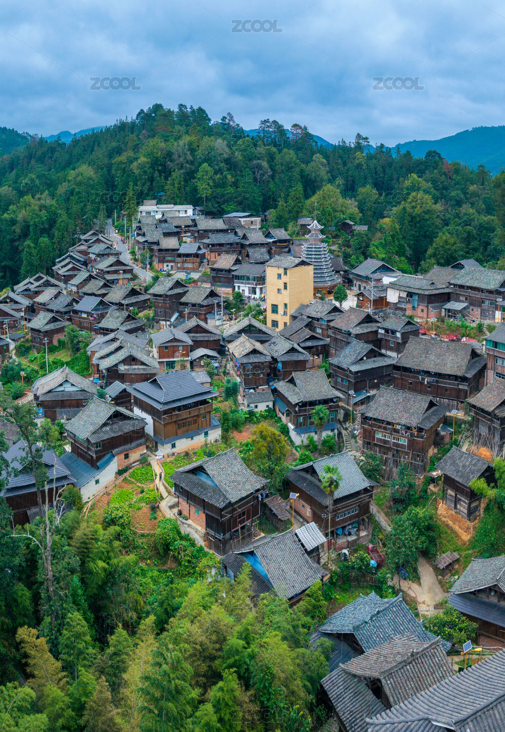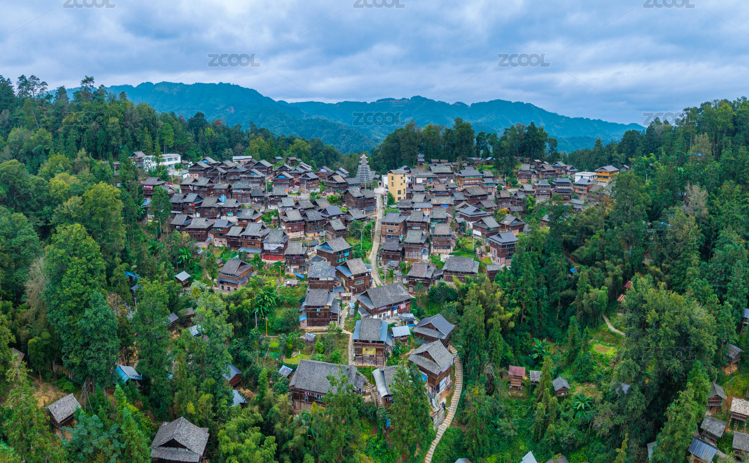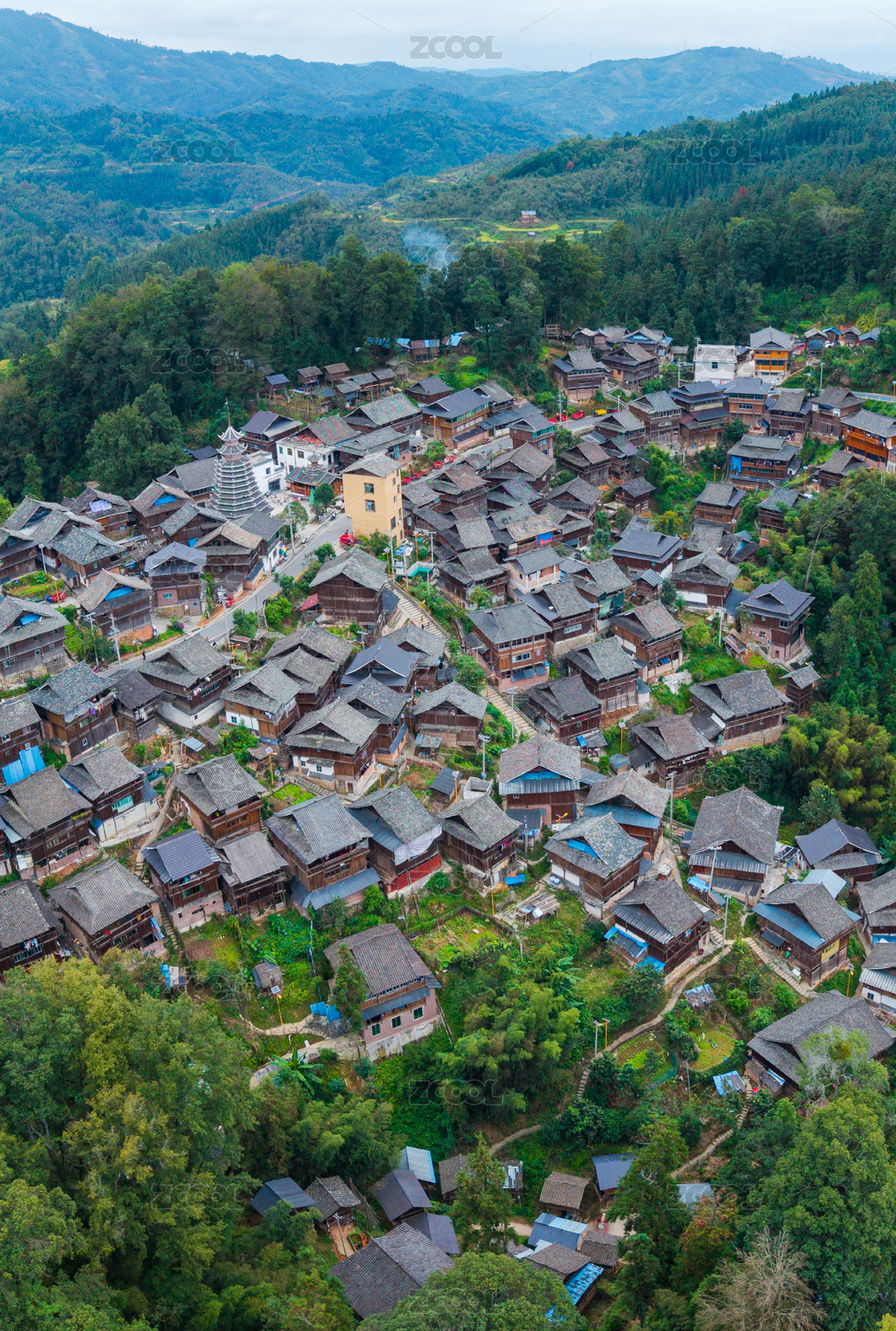 吊脚楼,航拍,全景,贵州,苗族村寨,古建筑,村落,依山而建,绿树,传统文化