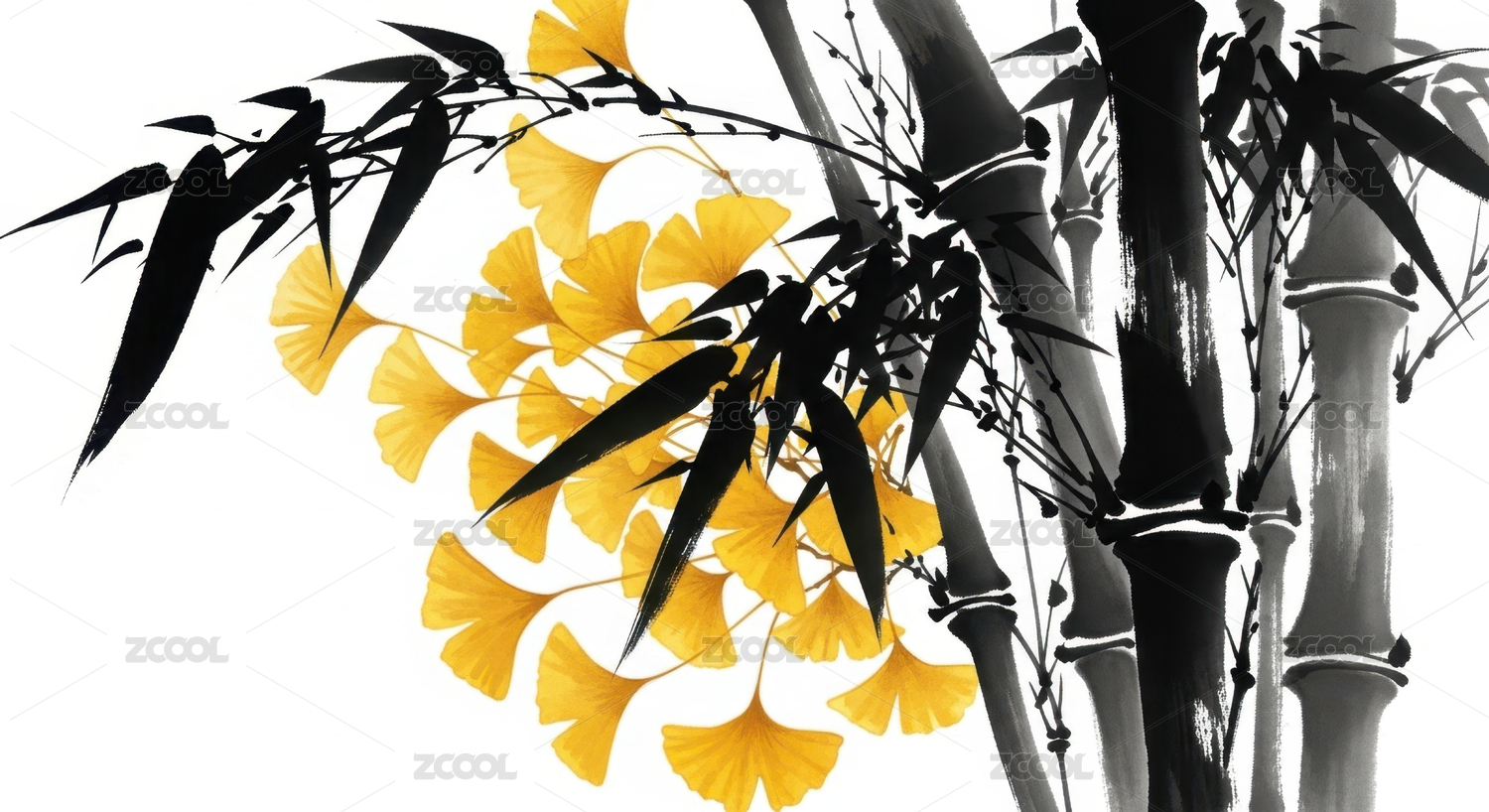 银杏,银杏叶,金色,中国风,传统,水墨,竹子,金叶,翠竹,写意