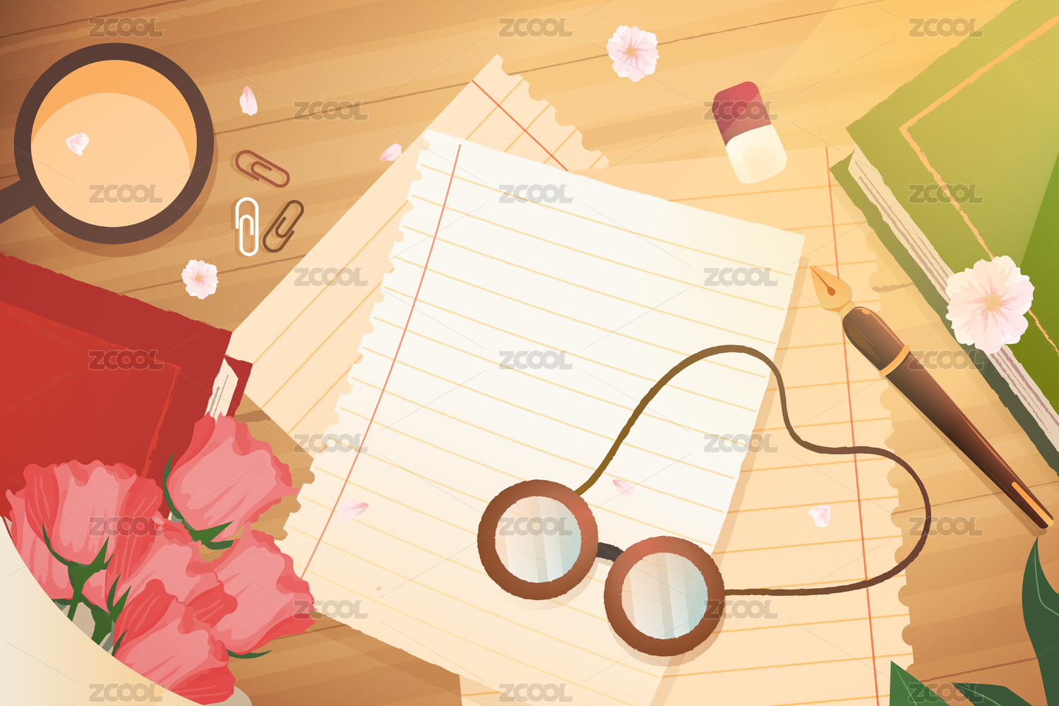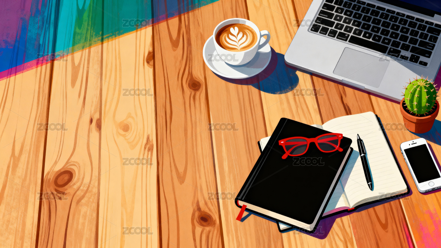 笔记本、笔、咖啡杯、书本、台历、眼镜、智能手表放在复古木质桌面上