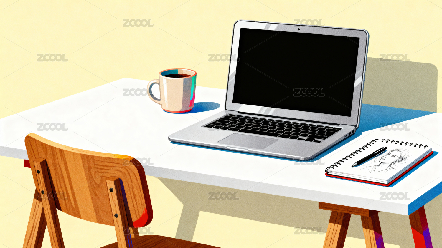 办公桌上放着咖啡文具蛋糕打开的笔记本
