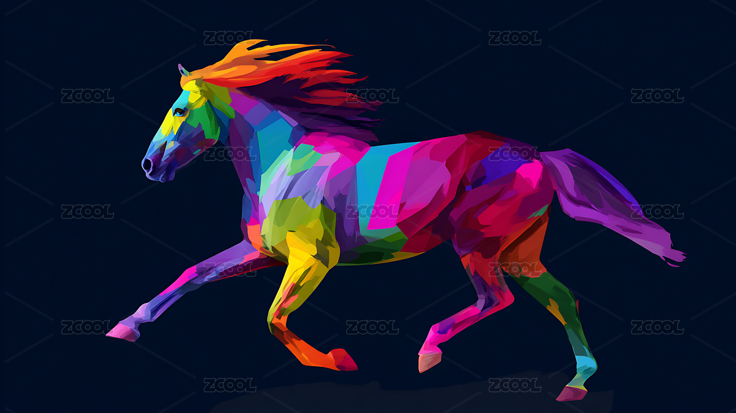 彩虹几何风格马在紫蓝背景中奔跑