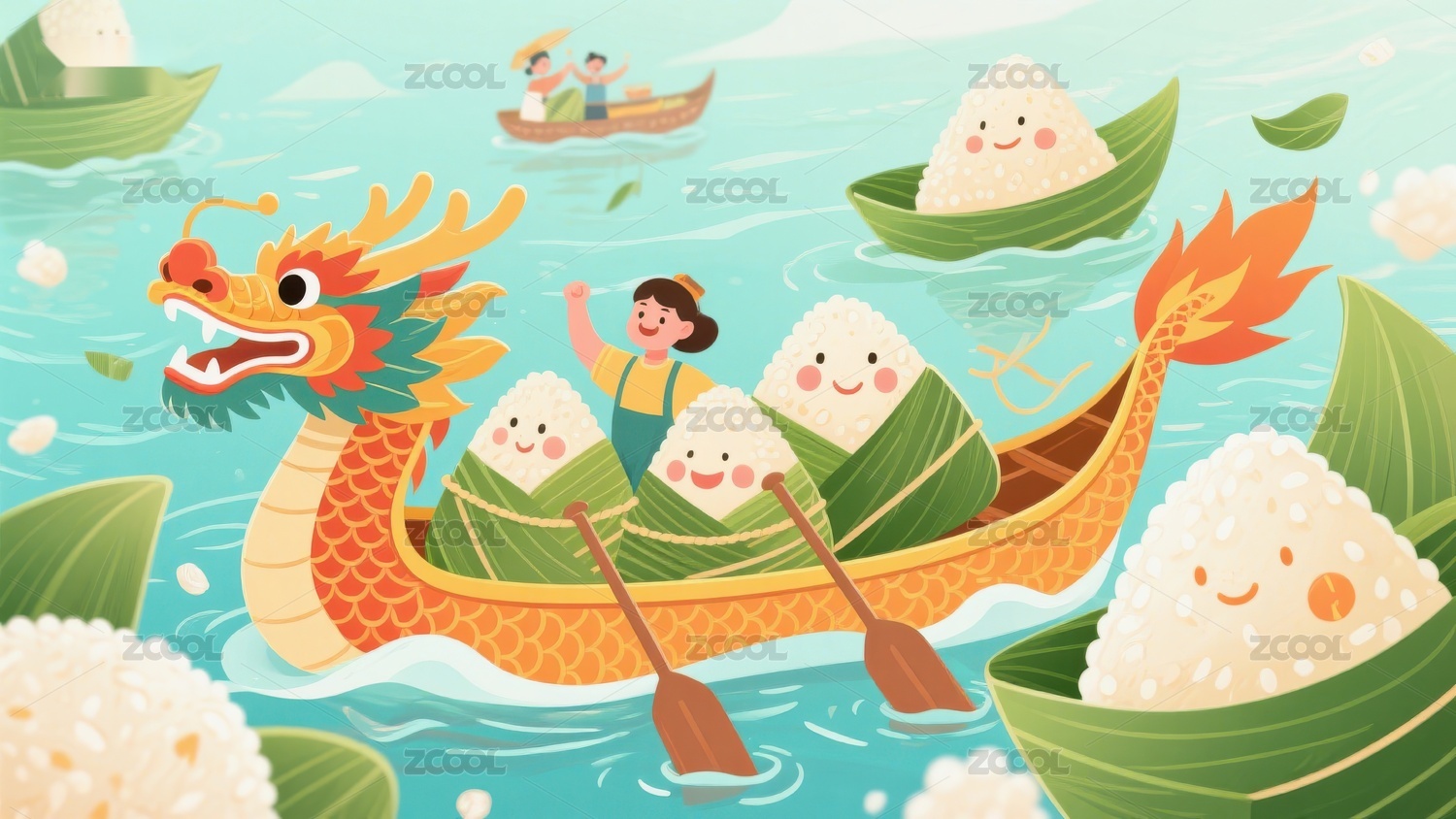 粽子乘龙舟,端午节欢乐场景