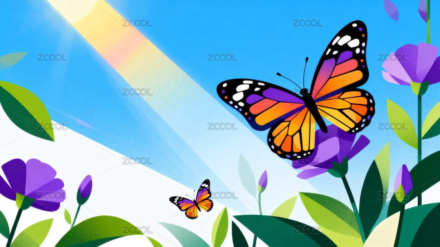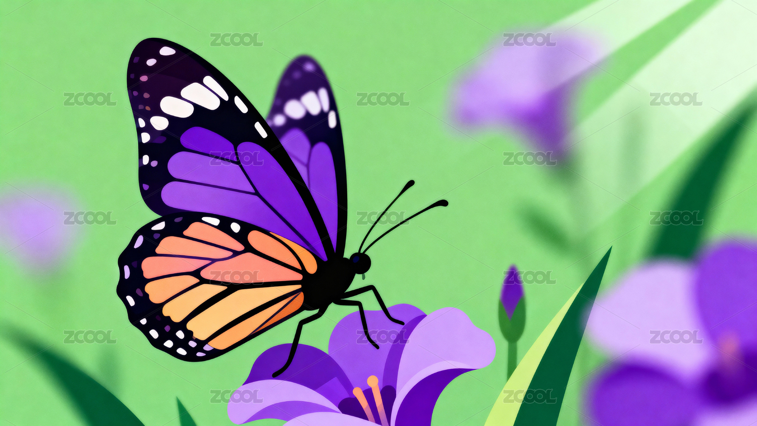 色彩斑斓蝴蝶与紫色花朵