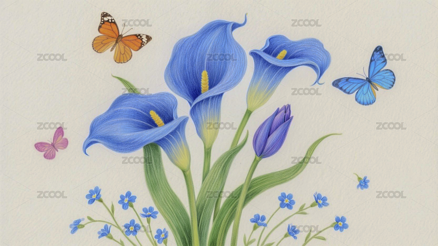 蓝色马蹄莲与蝴蝶