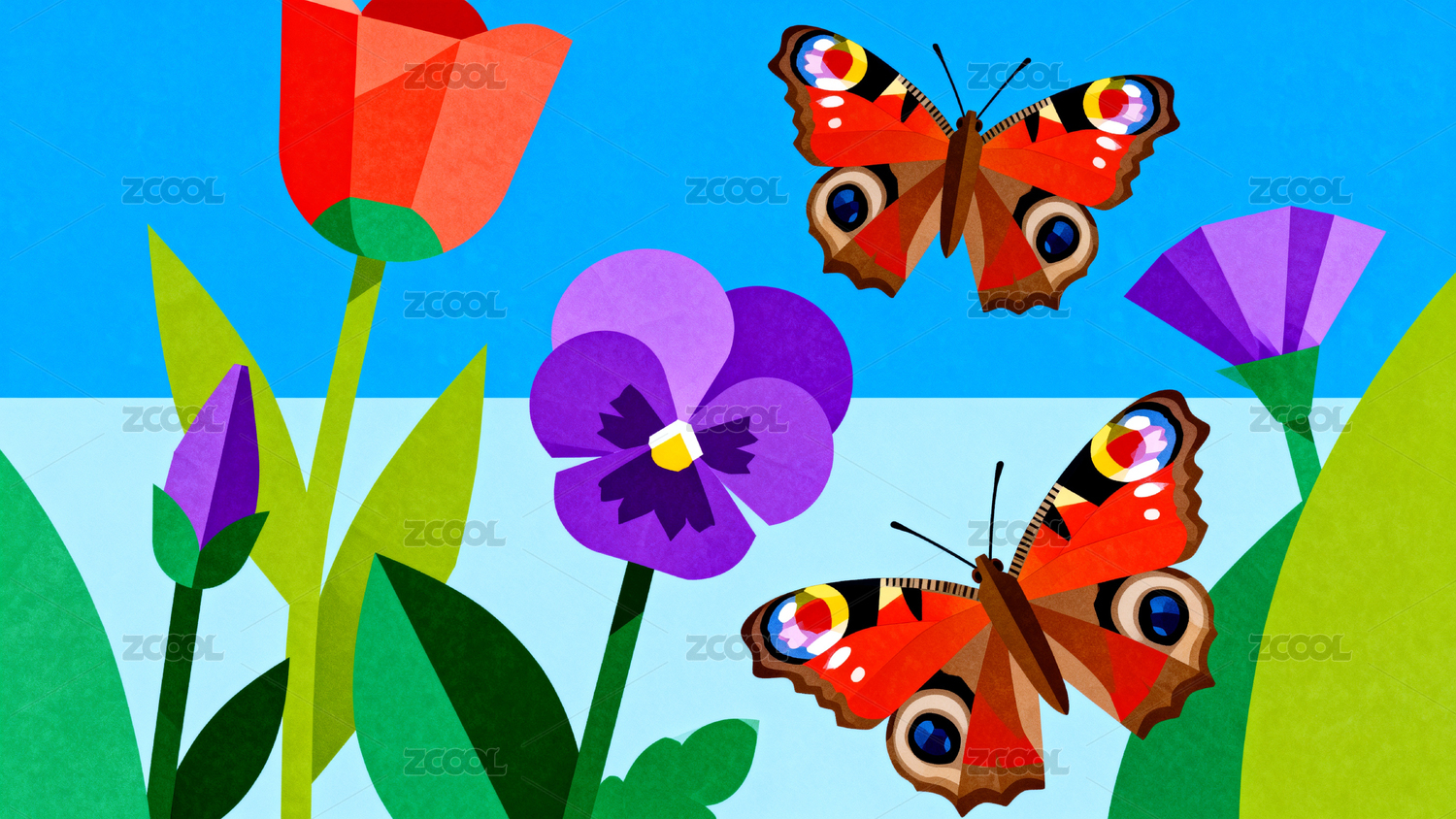 两只蝴蝶与紫色花朵的插画