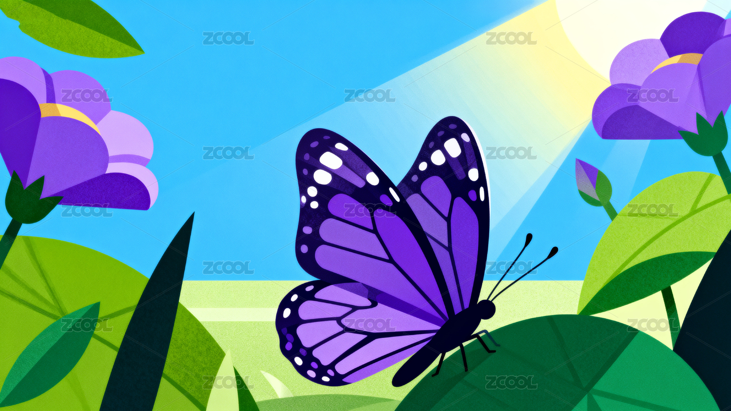紫色蝴蝶与花朵的美丽插画