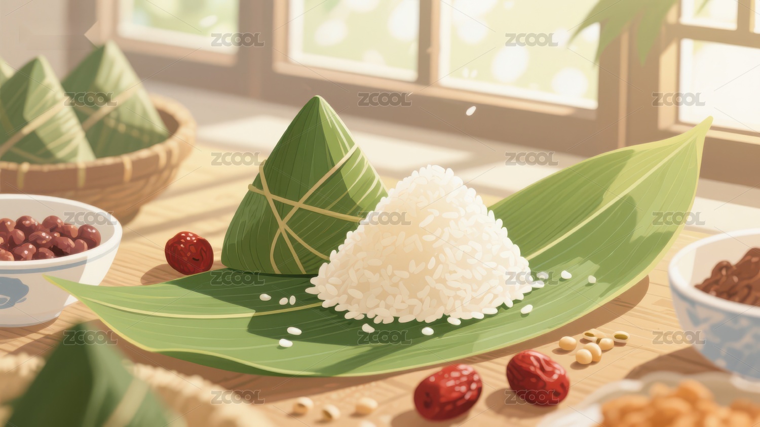 粽子,糯米,竹叶,红枣,豆子,碗装,蓝色,桌布,传统,美食