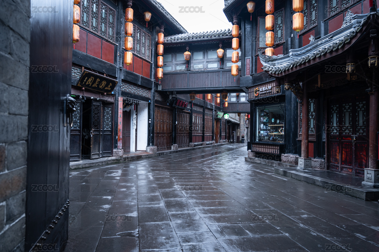 成都锦里川西民居建筑商业古街清晨雨后风光