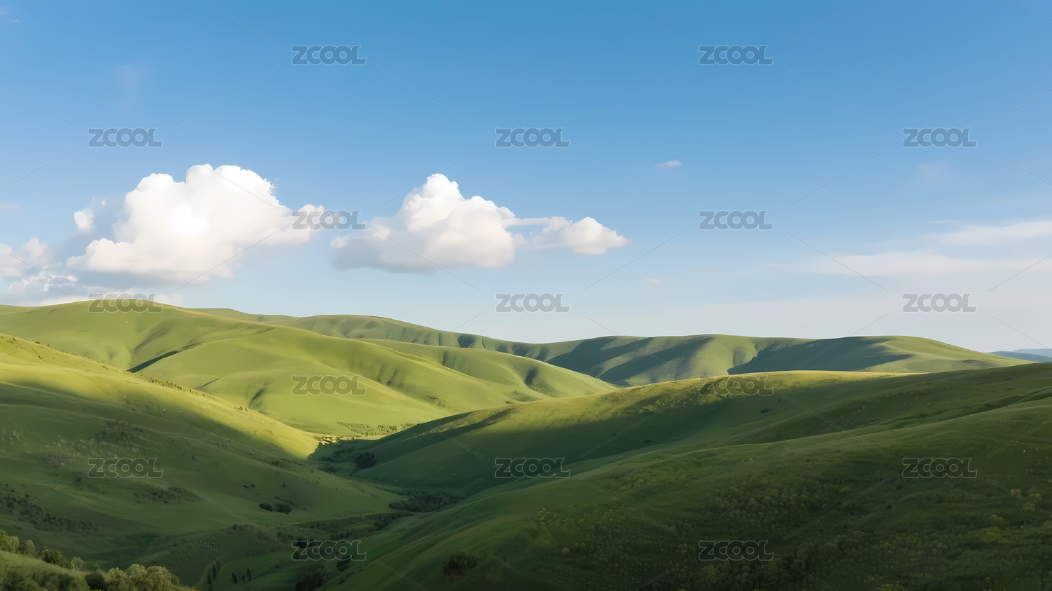 阳光下的绿色山丘与蓝天白云