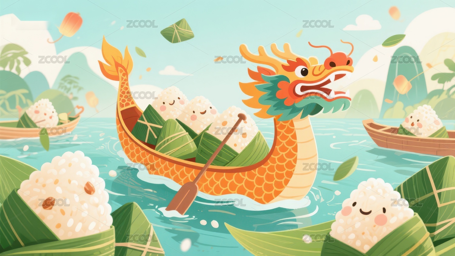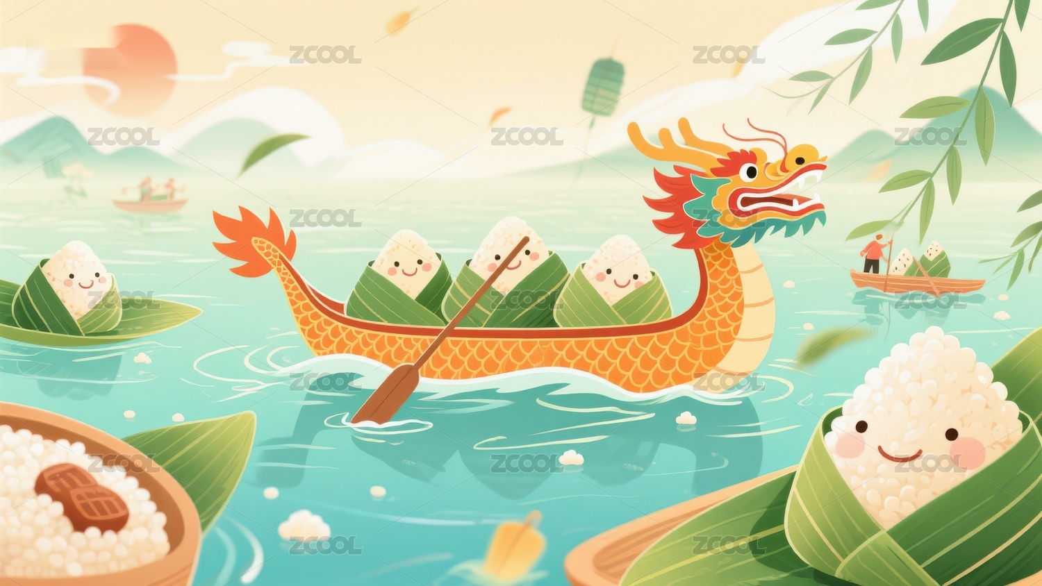 粽子划龙舟,端午节趣味插画