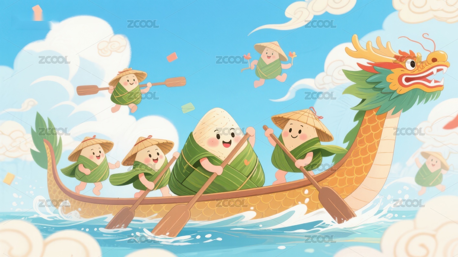 端午,龙舟,粽子,竞渡,节日,传统,习俗,卡通,可爱,水面