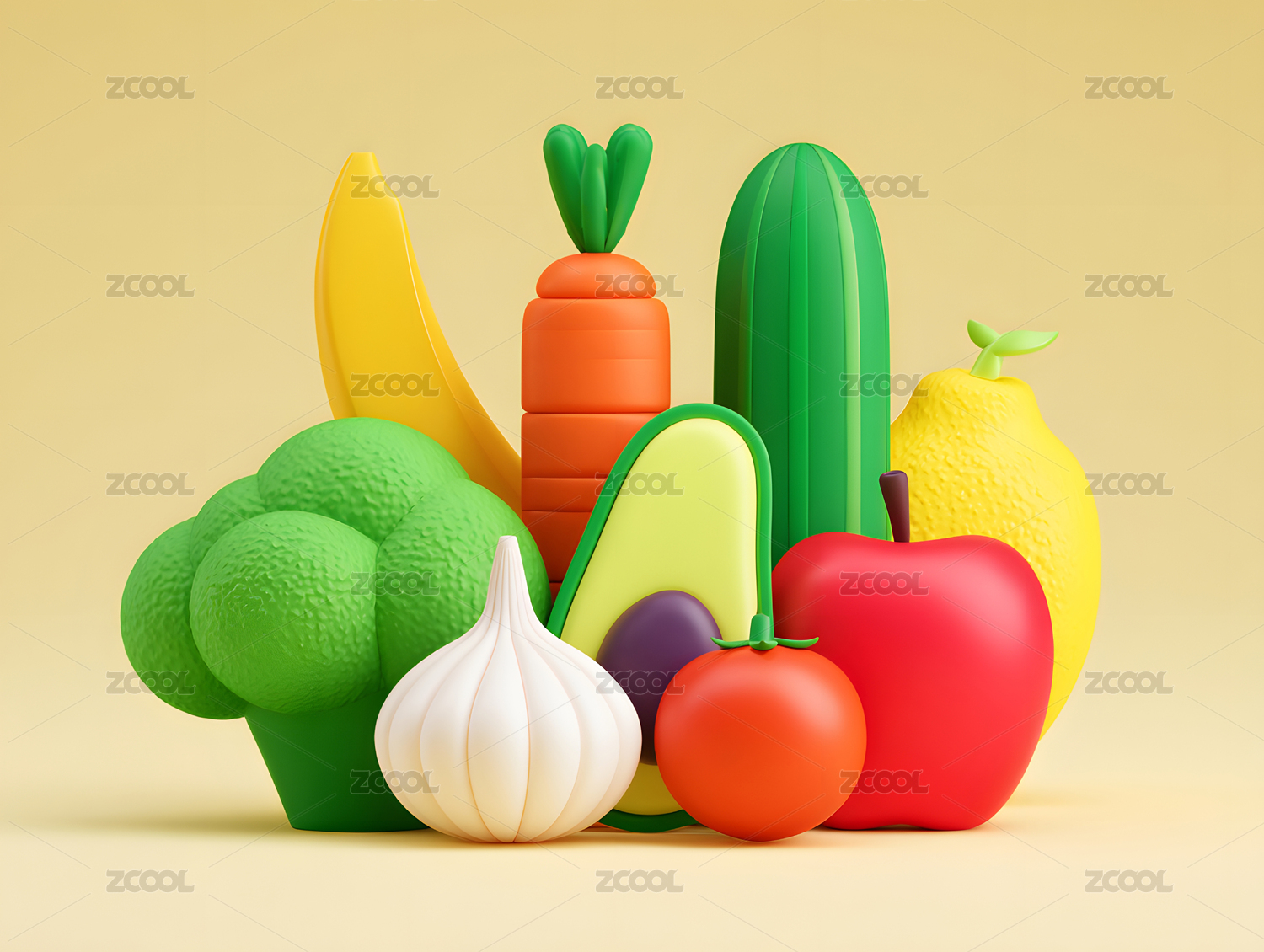 新鲜蔬菜水果产品3D渲染健康食物背景插画