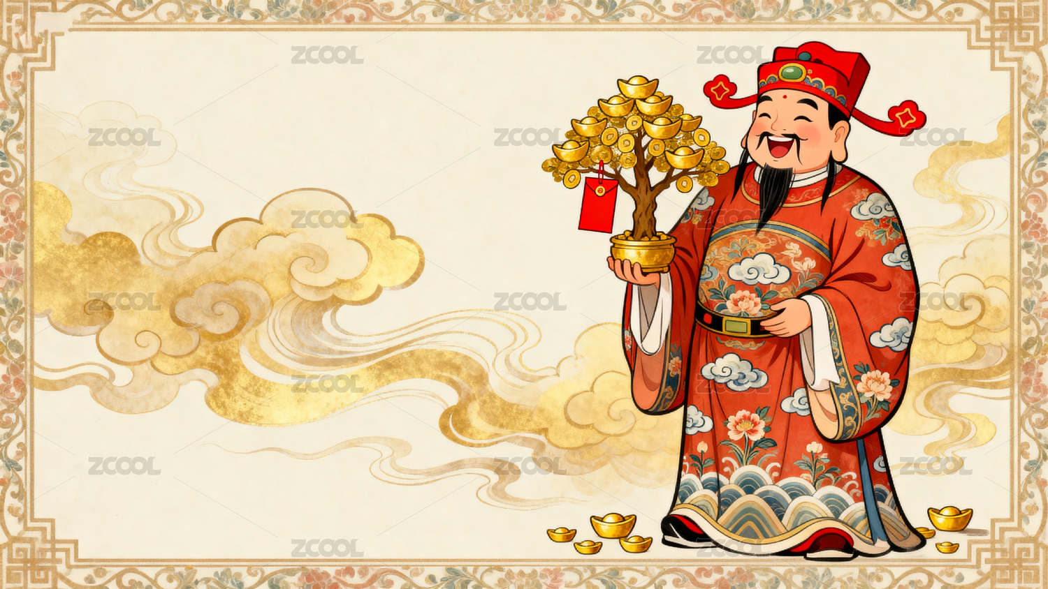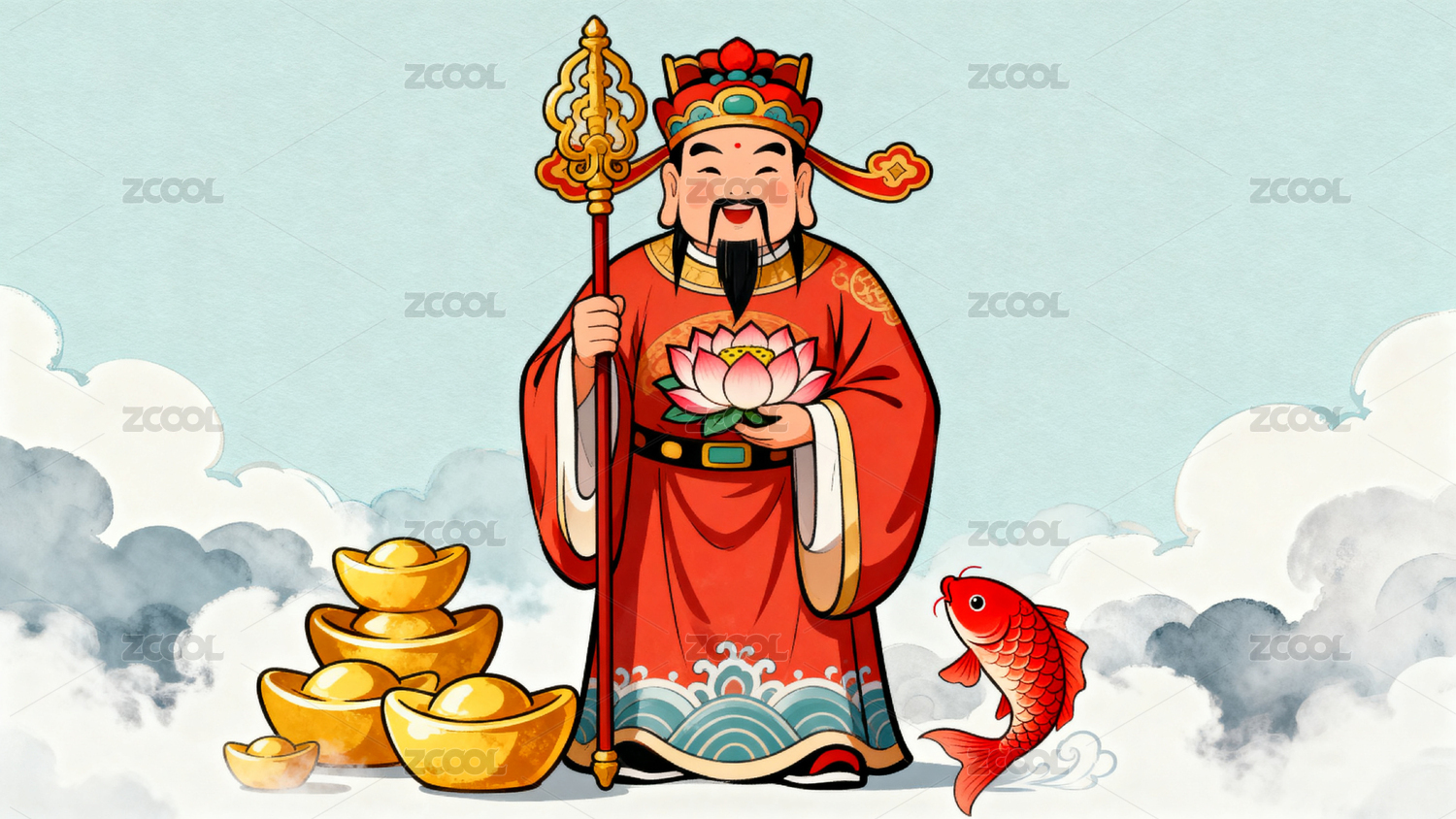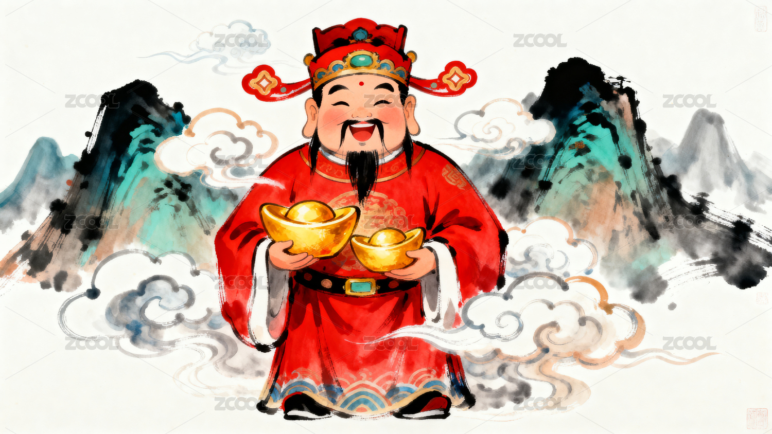 红色,装饰,图案,胡须,金元宝,吉祥,金色,绿色,财神,服饰