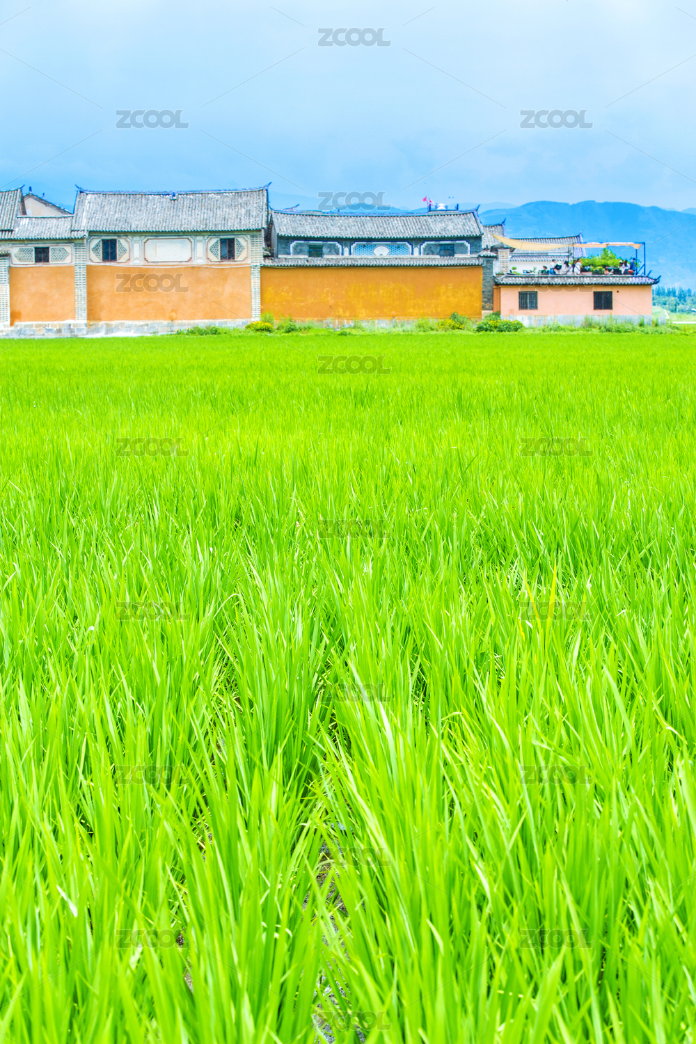 中国云南省大理市喜洲古镇乡间水稻田园风光