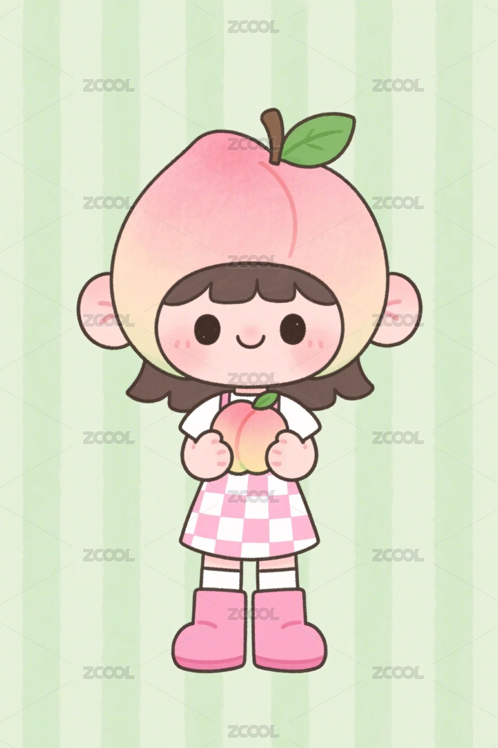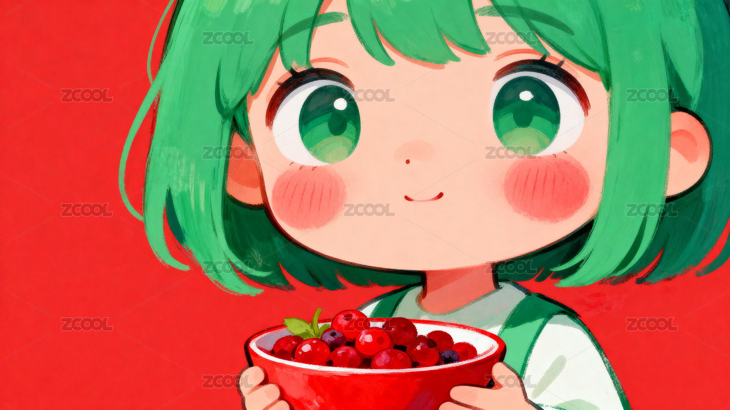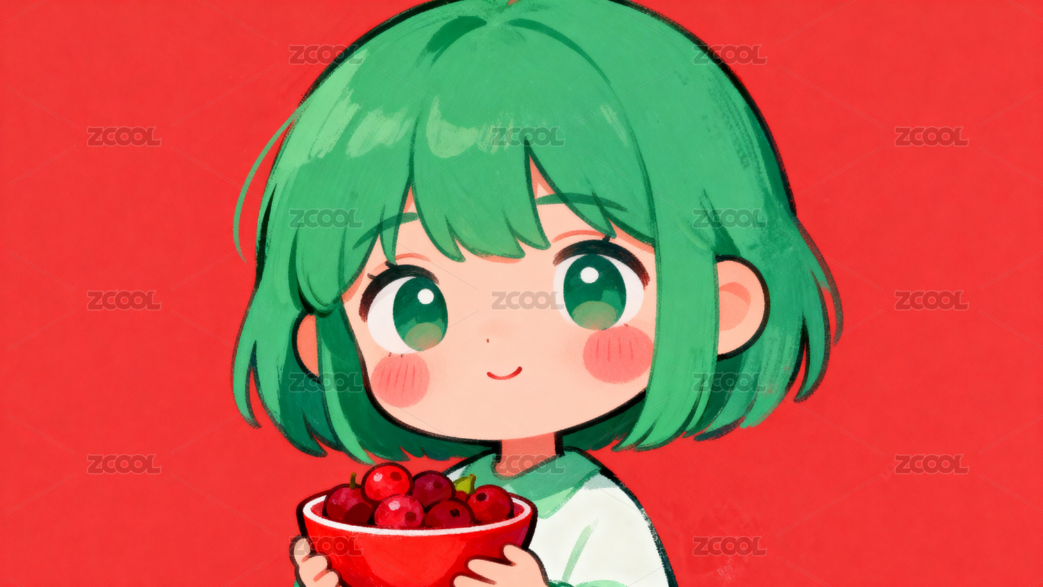 红色,卡通,背景,笑容,头发,绿色,叶子,碗,人物,可爱