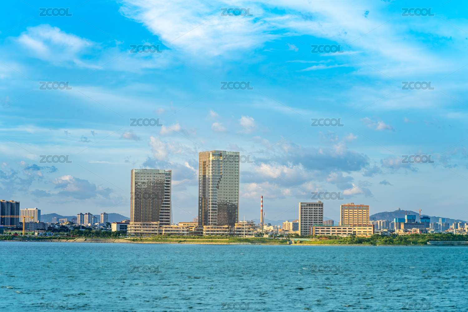 夏季晴朗天空下远眺海口湾西海岸的建筑群