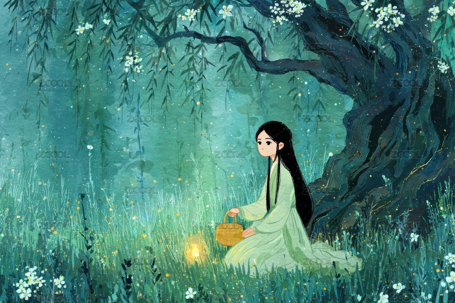 绿绿的草地上有个穿白裙子的女孩站在大树下