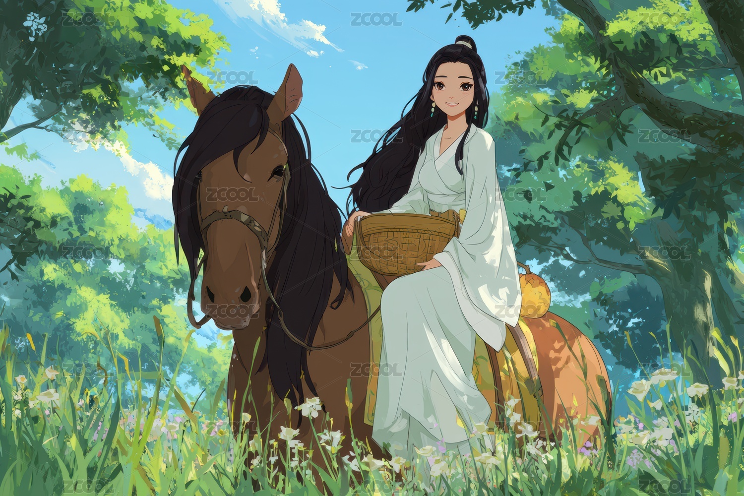 花草,少女,竹林,篮子,长发,白袍,白马,橙果,晨雾
