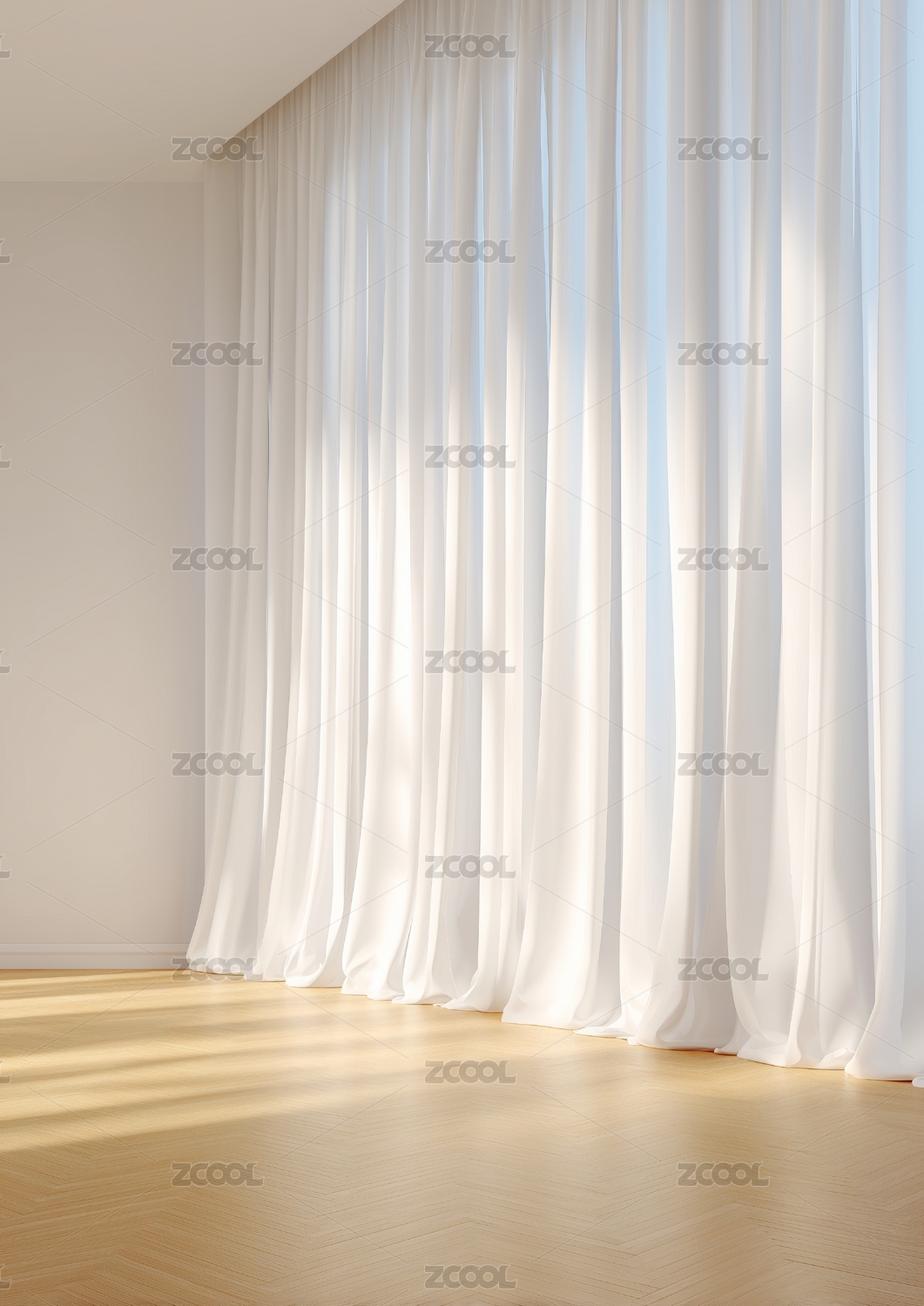 明亮的空房间与穿过窗帘的阳光光,三维渲染