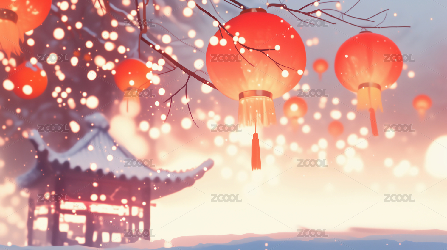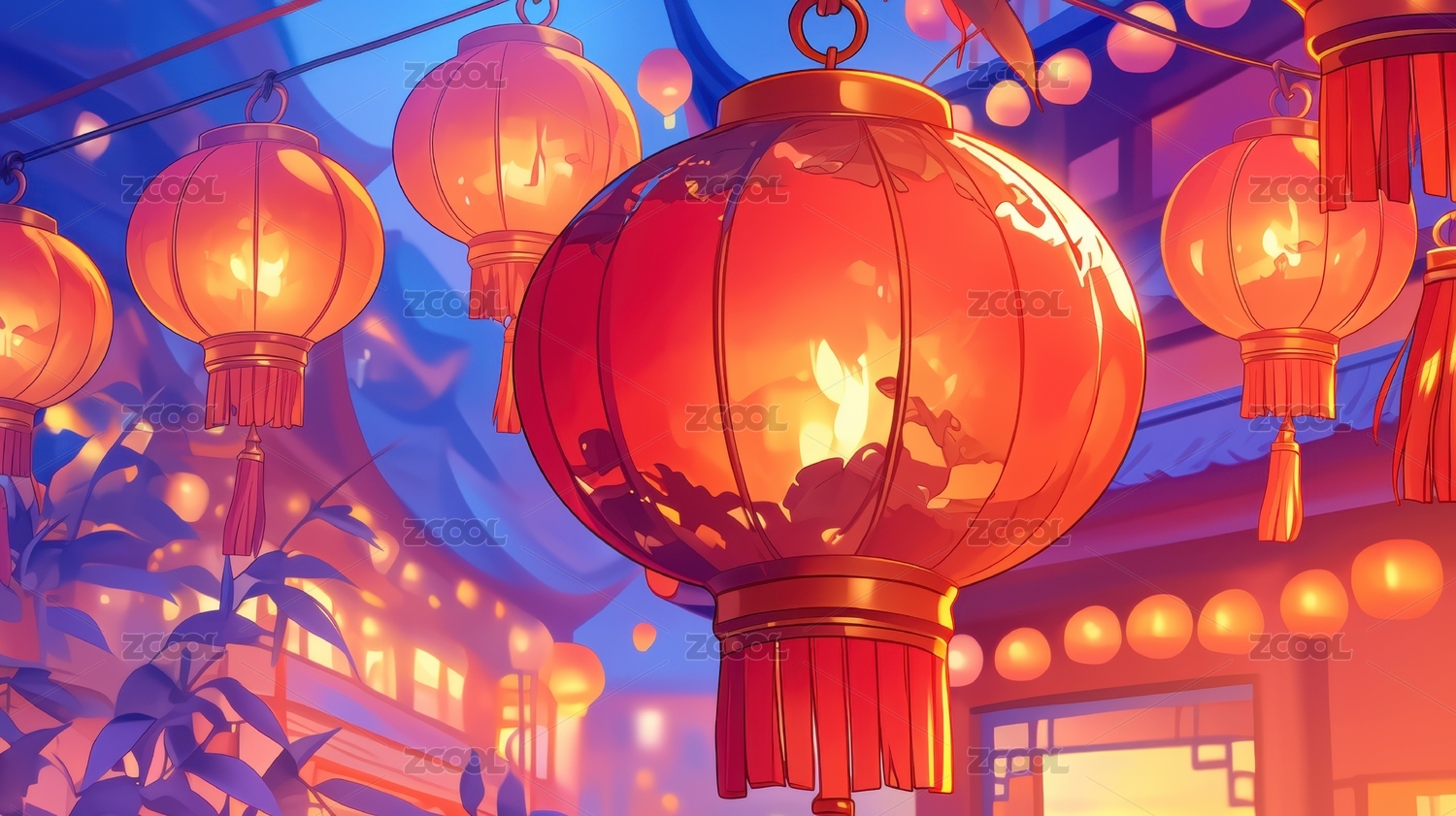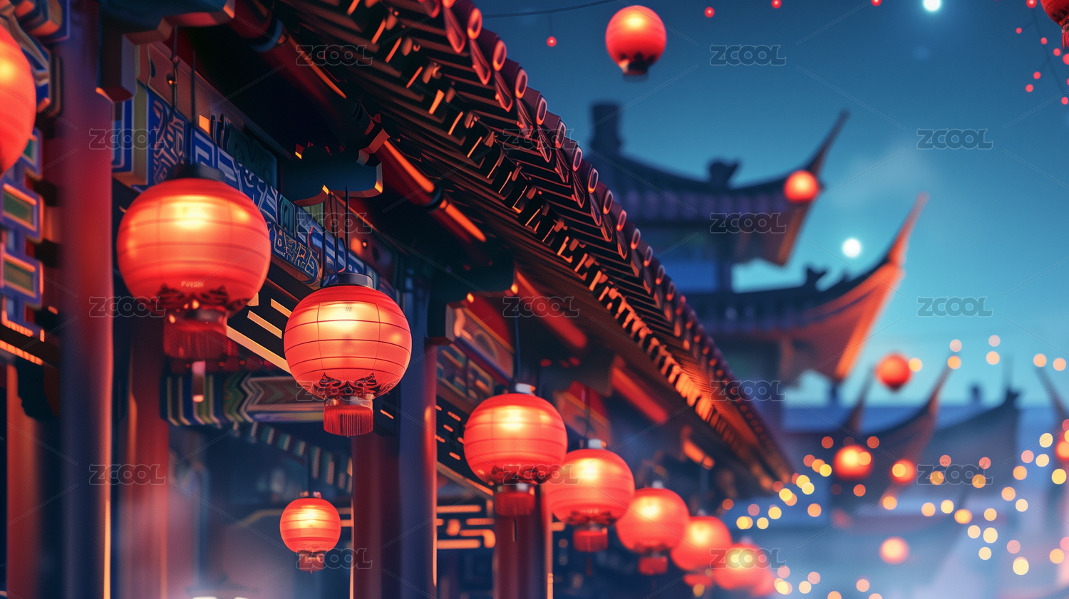 夜晚挂着传统红灯笼的中国古典建筑插画绘画