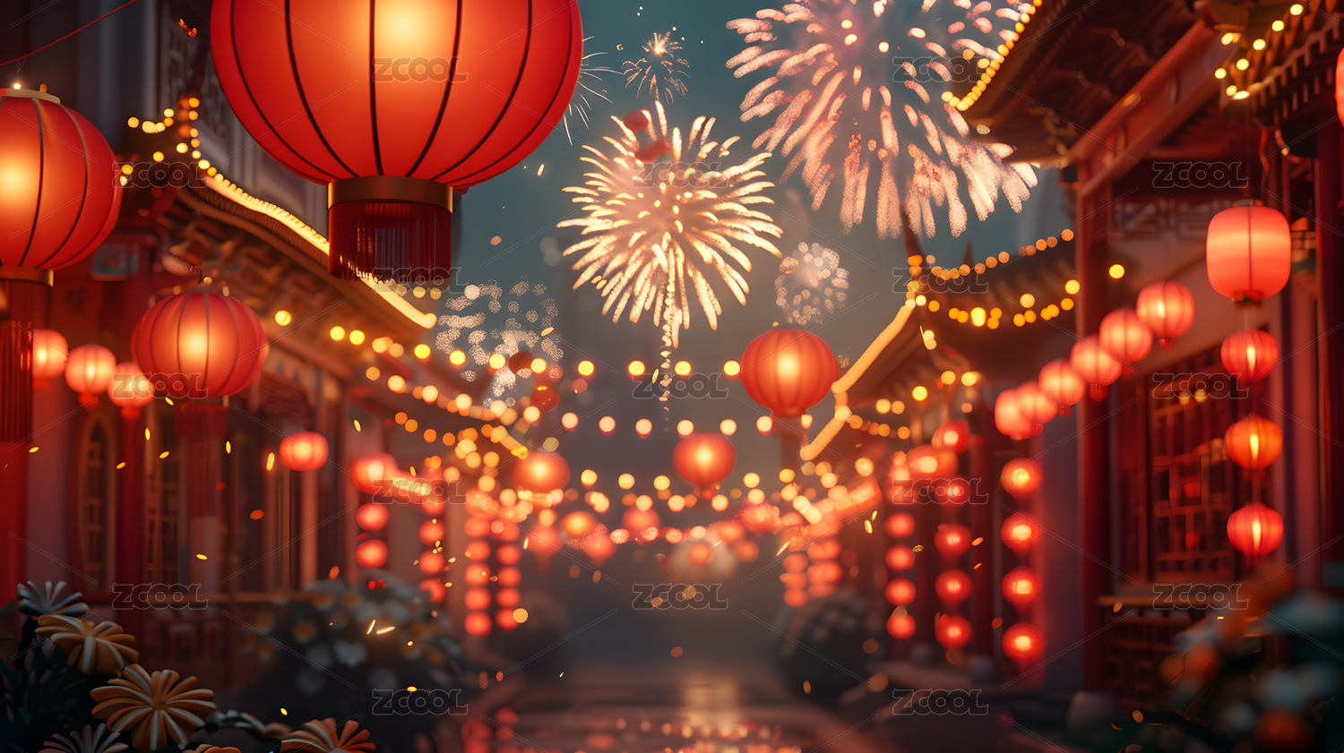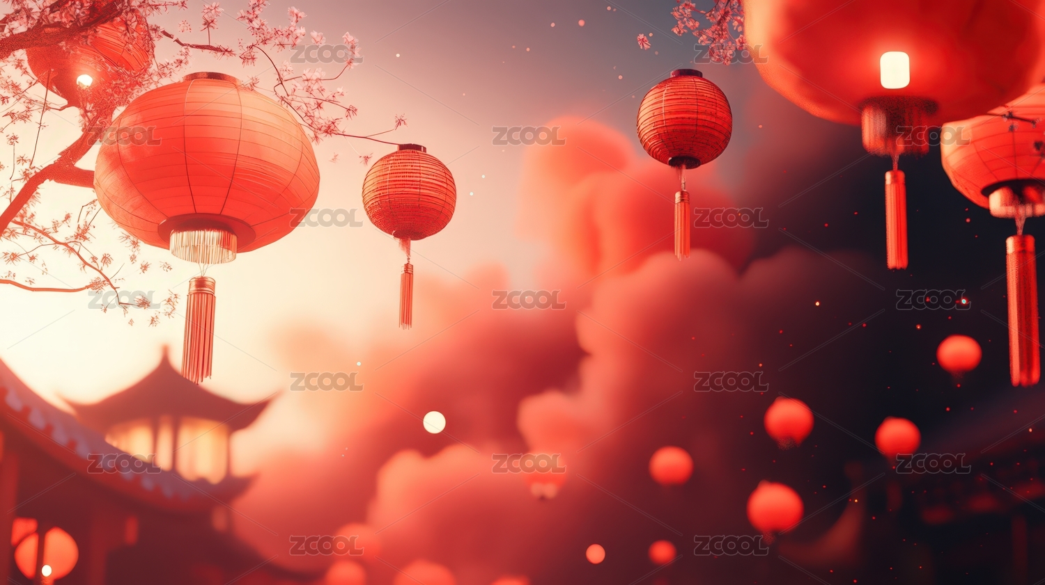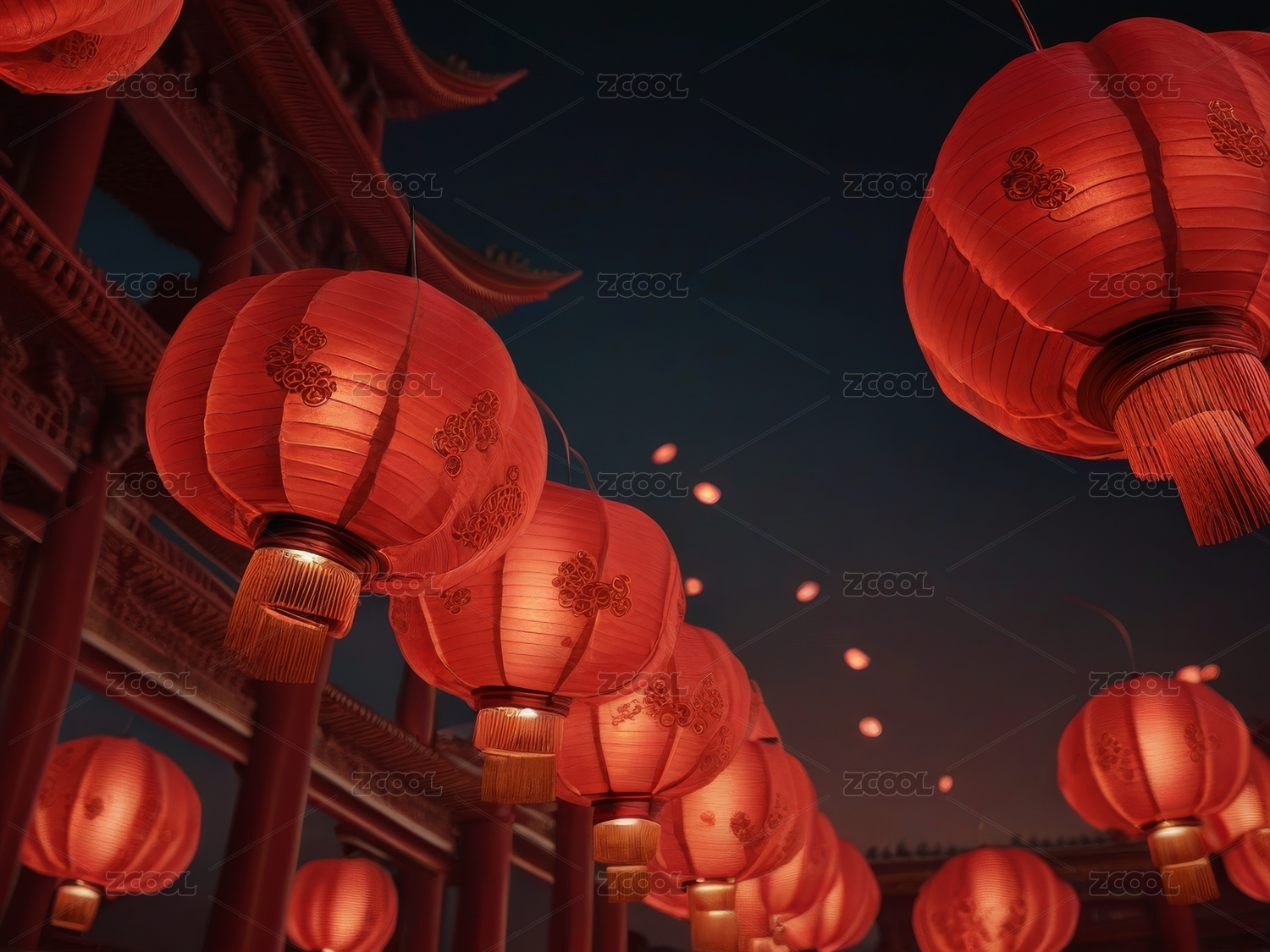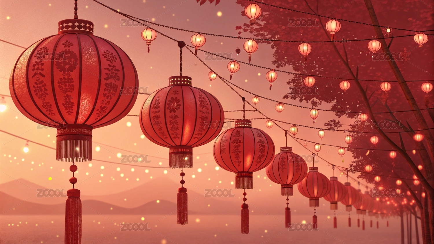 夜晚挂着传统红灯笼的中国古典建筑插画绘画