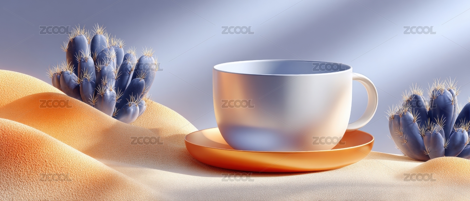简约风格的陶瓷杯与仙人掌静物摆拍