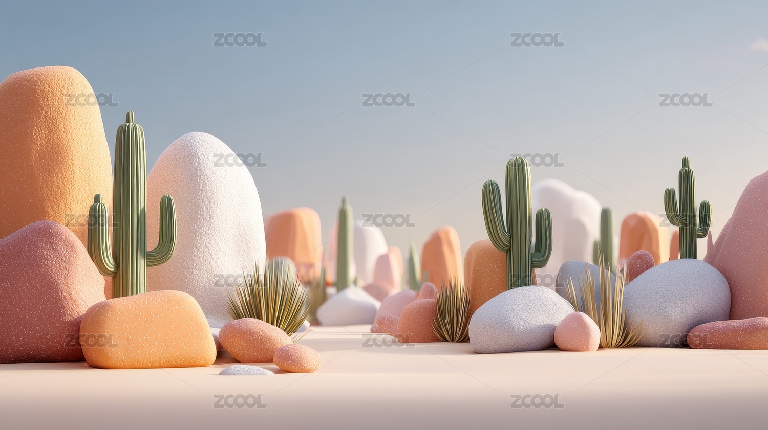 可爱的3D渲染沙漠场景与仙人掌和石头