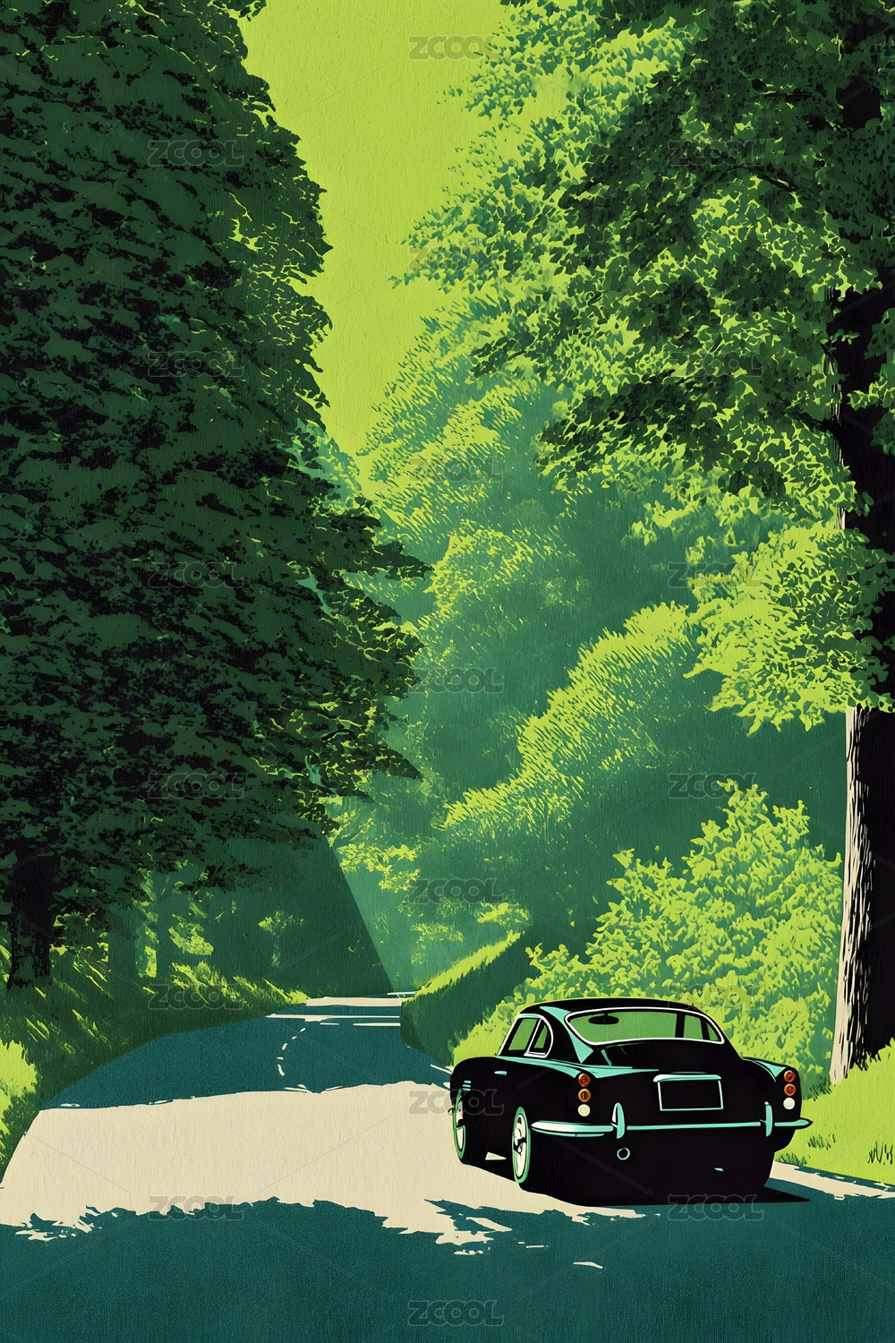 林荫大道跑车行驶,绿色阳光洒满,氛围舒畅