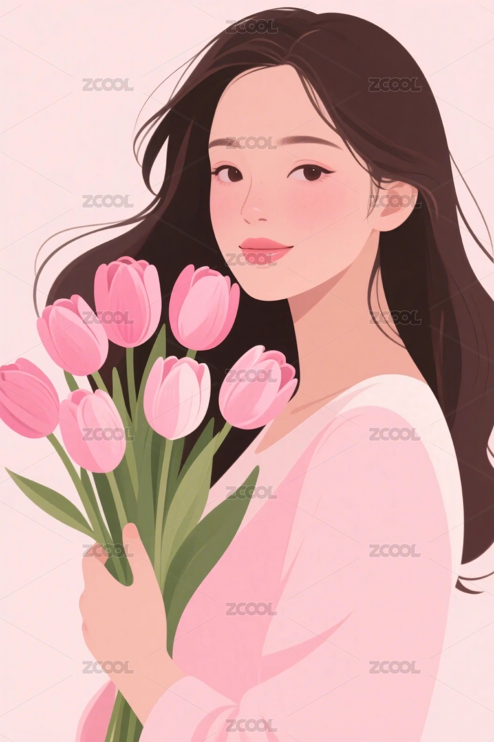 女性与粉色郁金香插画