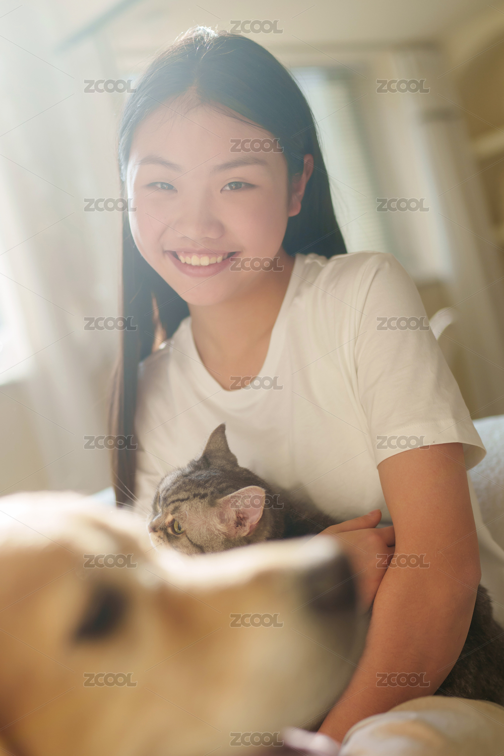 一位快乐女孩抱着宠物猫和宠物狗玩耍