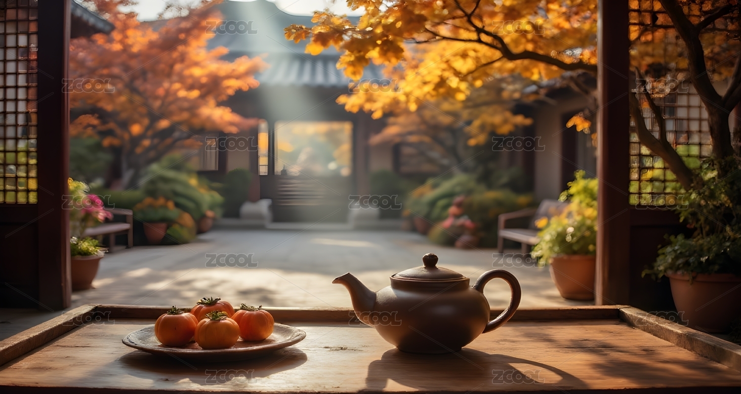 木桌,茶具,茶壶,茶杯,柿子,黄叶,静物,中式,生活,场景