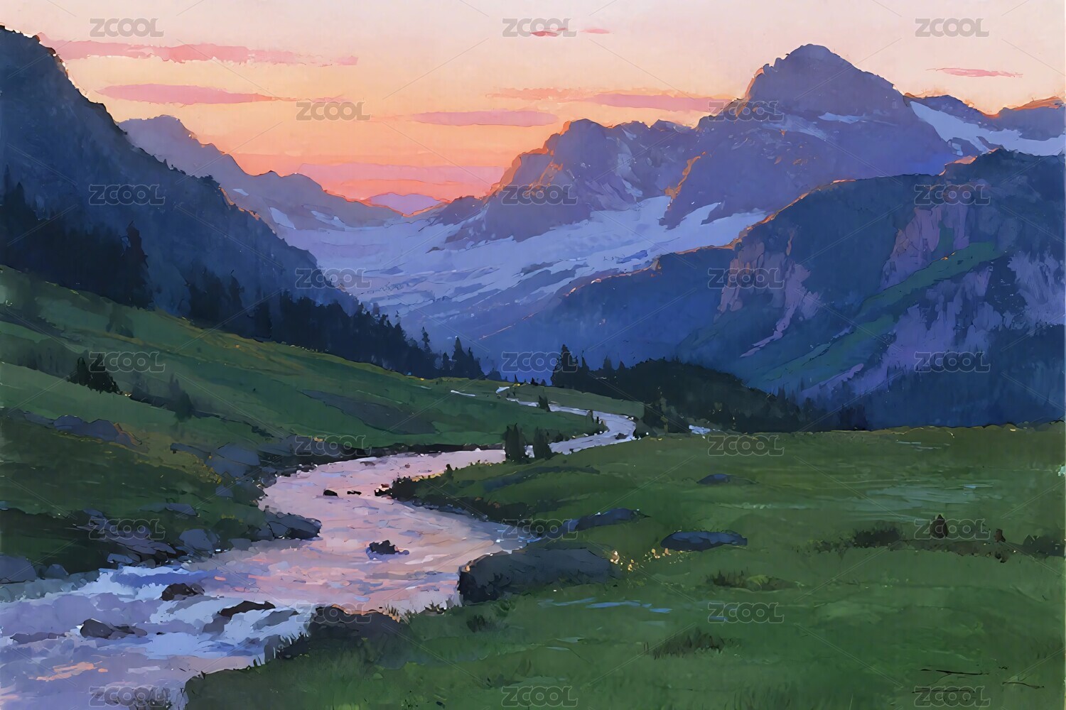 山水,风景,河流,山脉,插画,油画,背景,自然,色彩,风景画