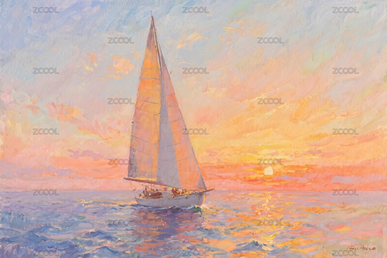 帆船,大海,海岸线,山丘,天空,云朵,绘画,艺术,海景,船只