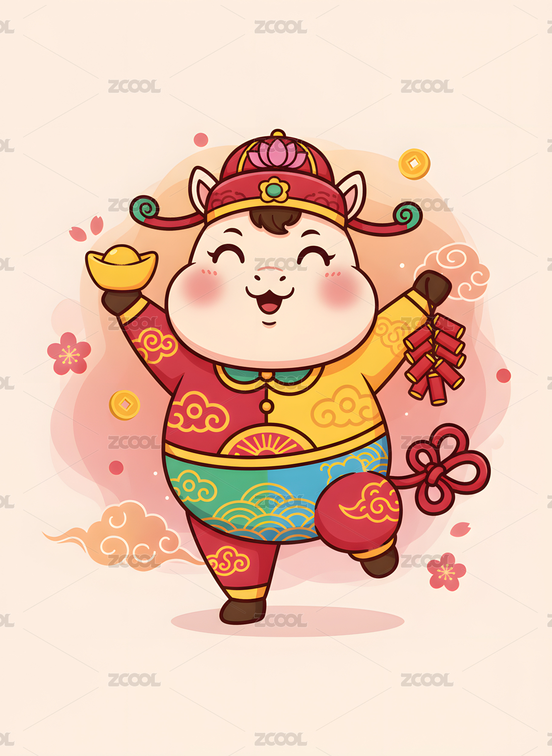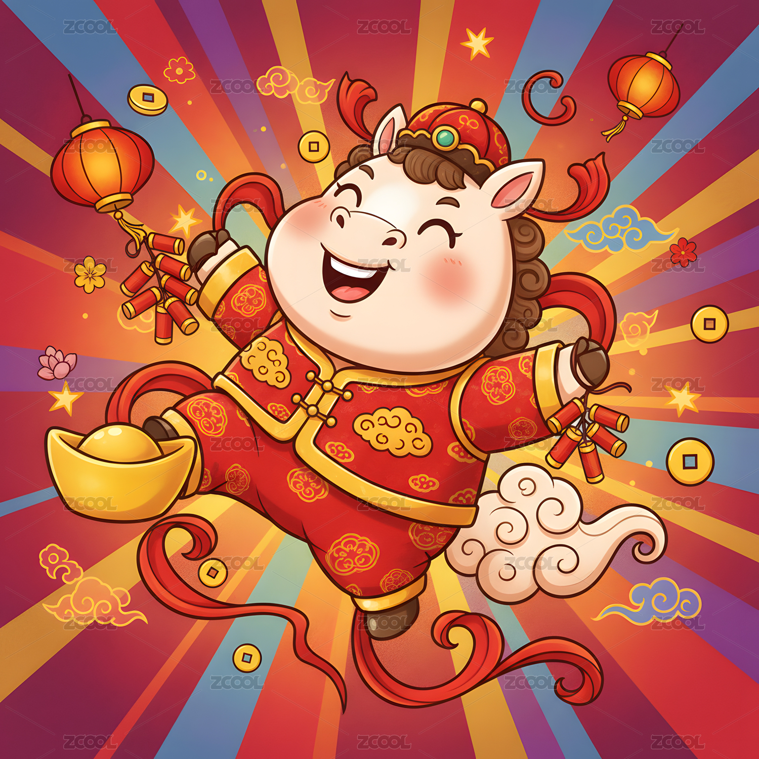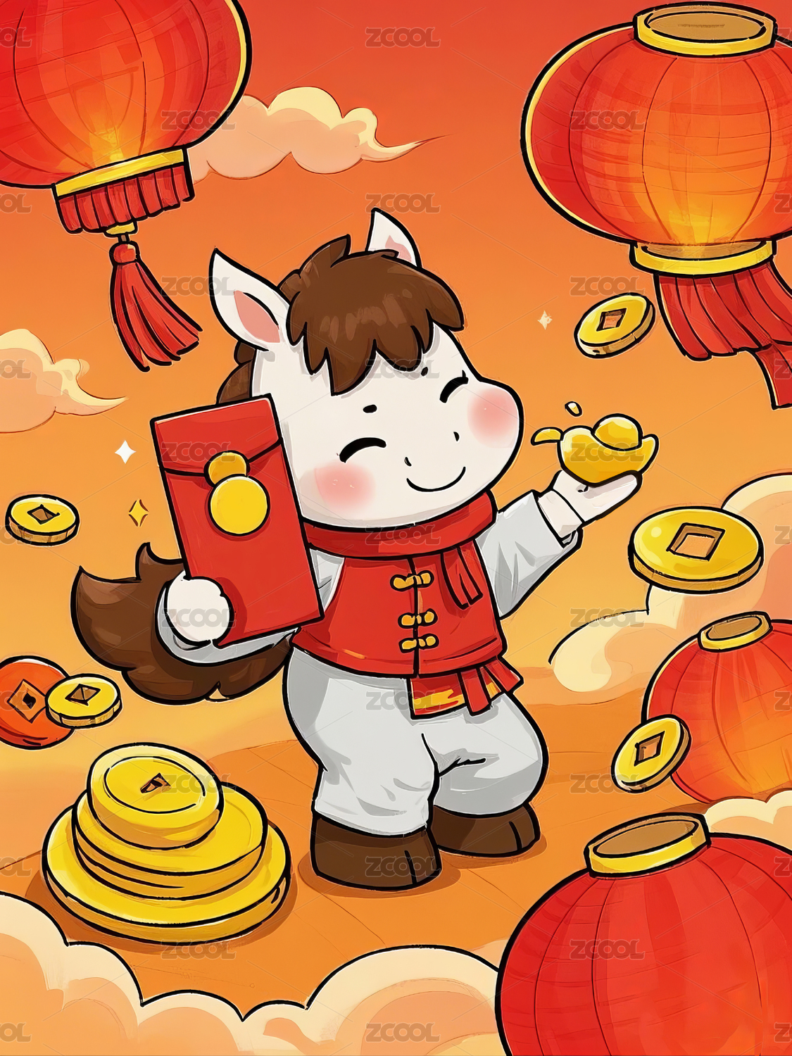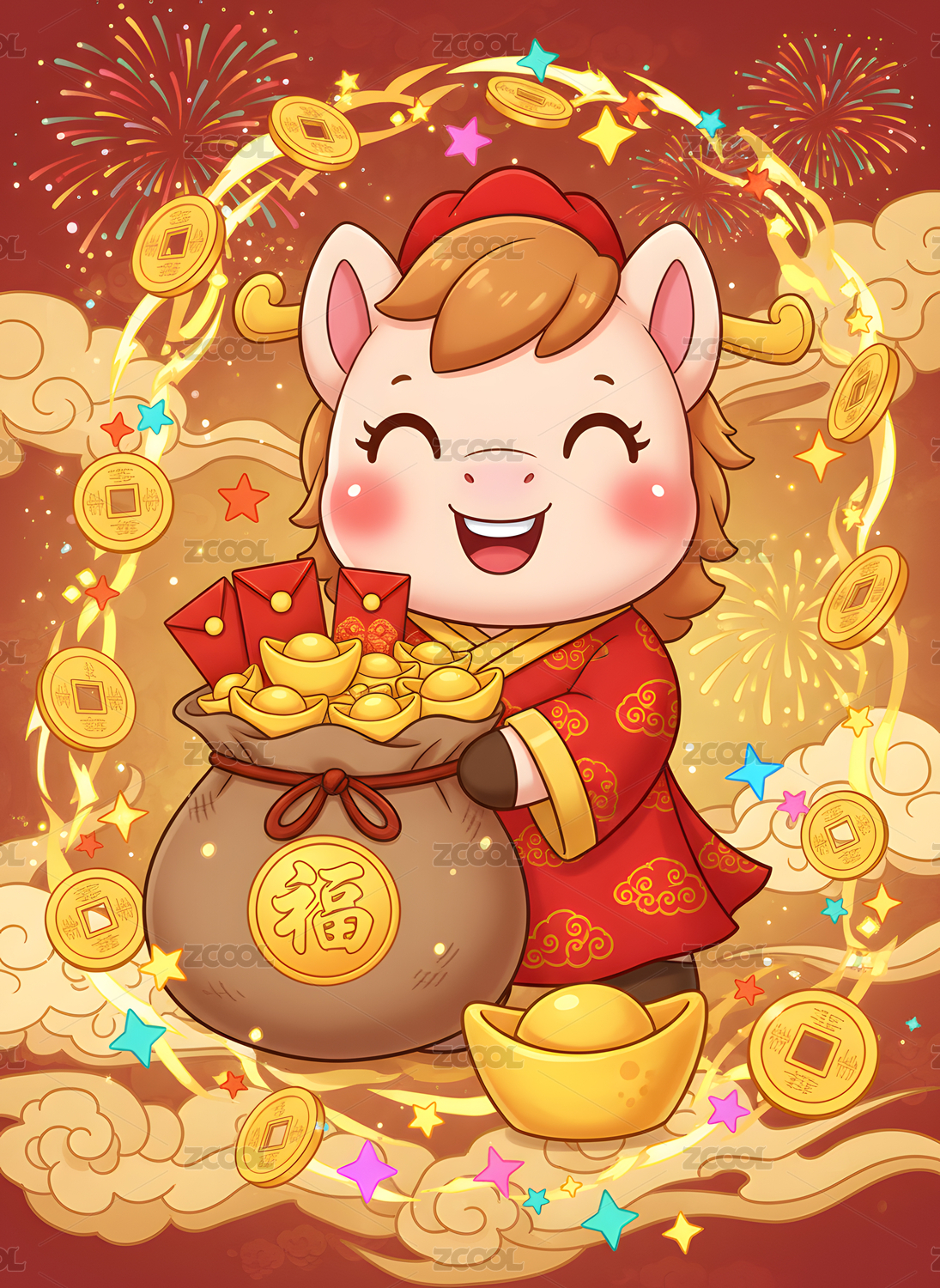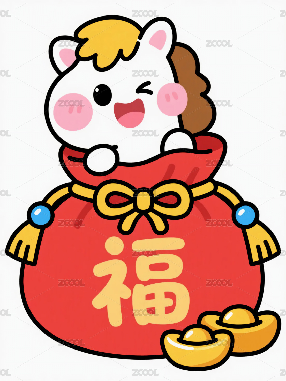 喜庆,欢乐,吉祥,马年,福袋,元宝,金币,财富,马,卡通