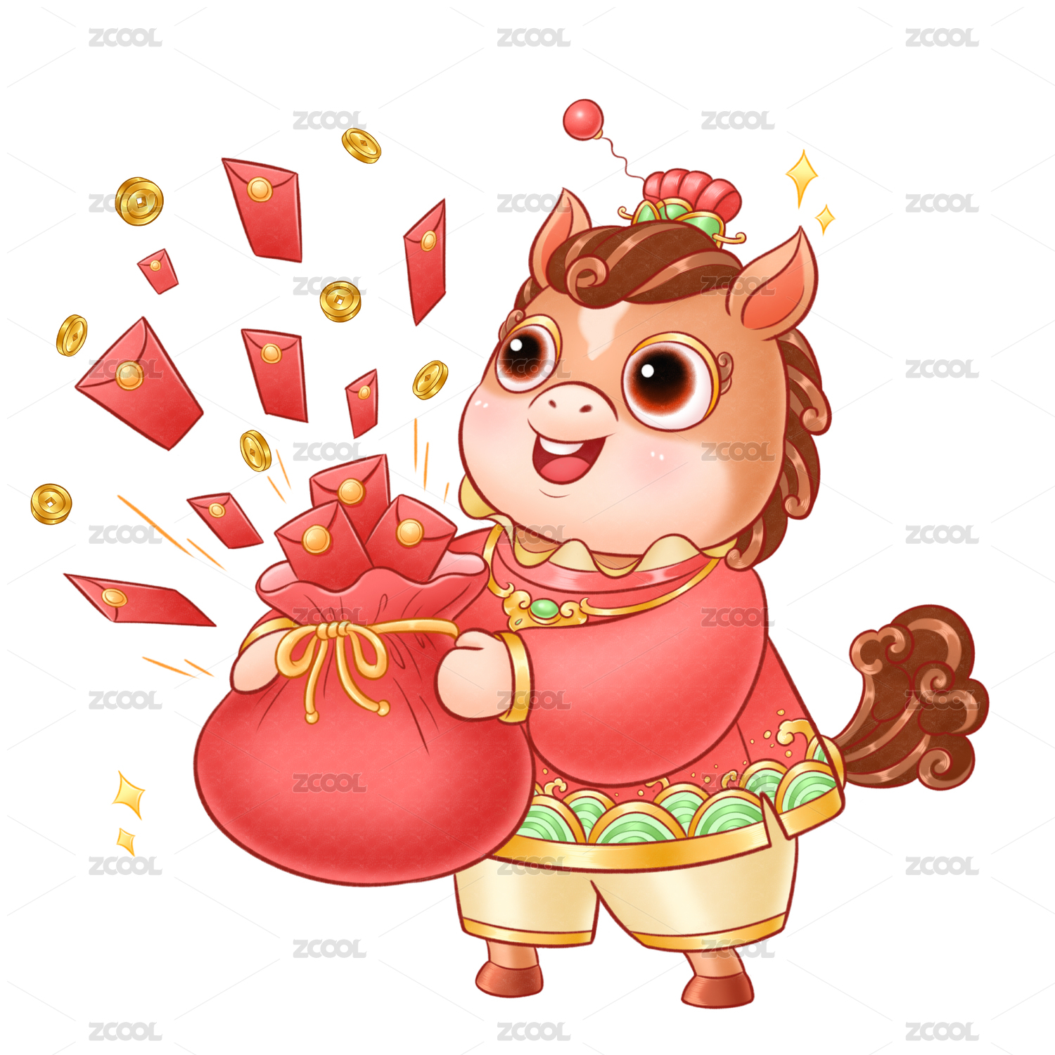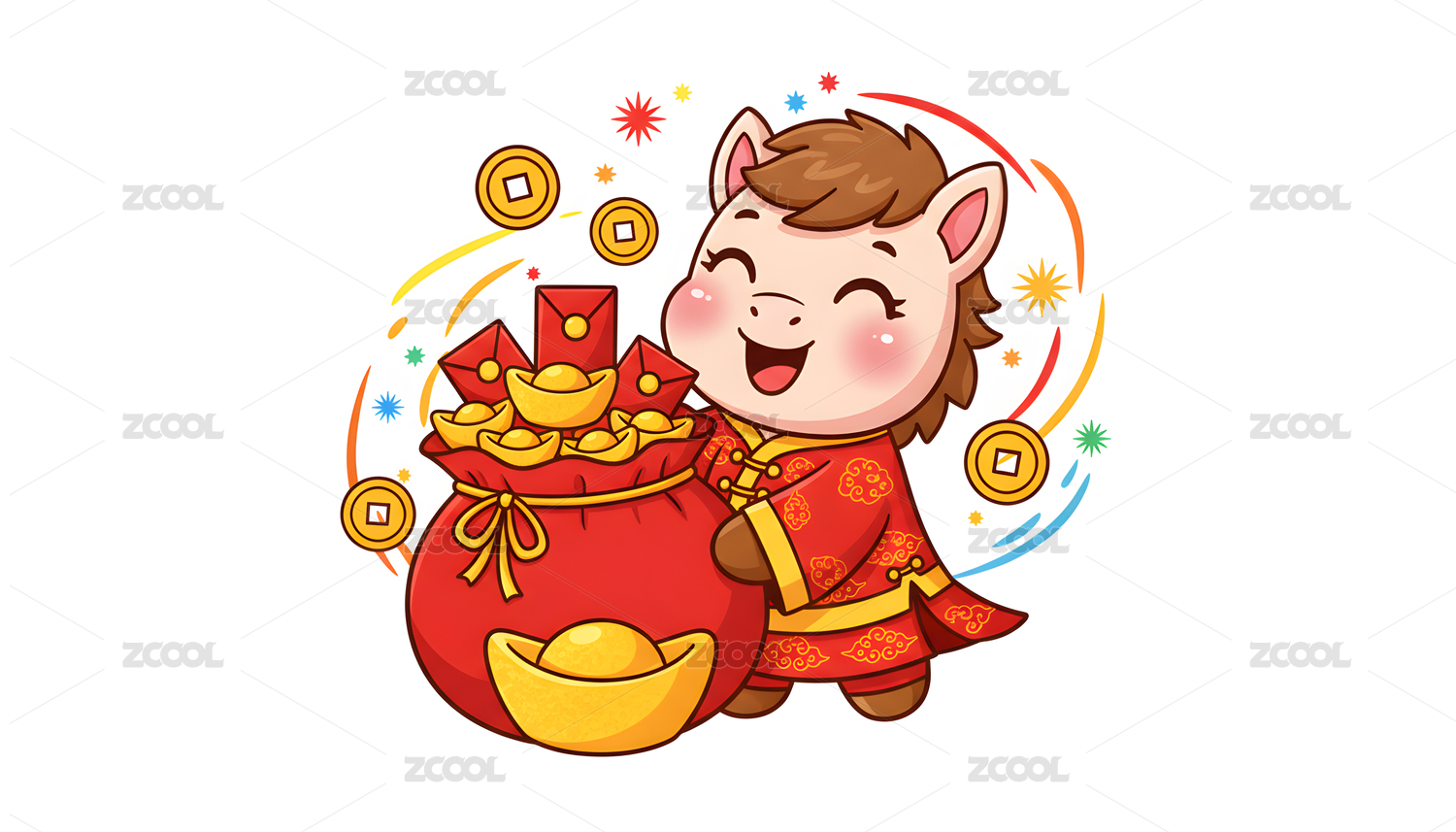 喜庆,欢乐,吉祥,马年,福袋,元宝,金币,财富,马,卡通