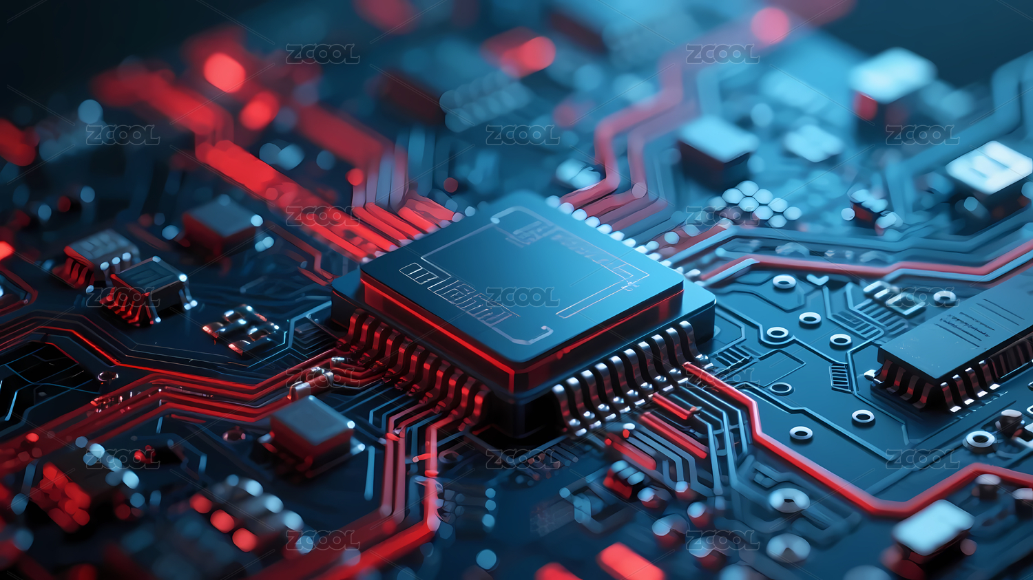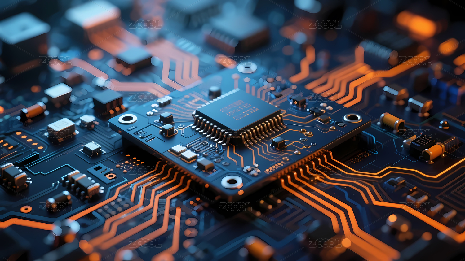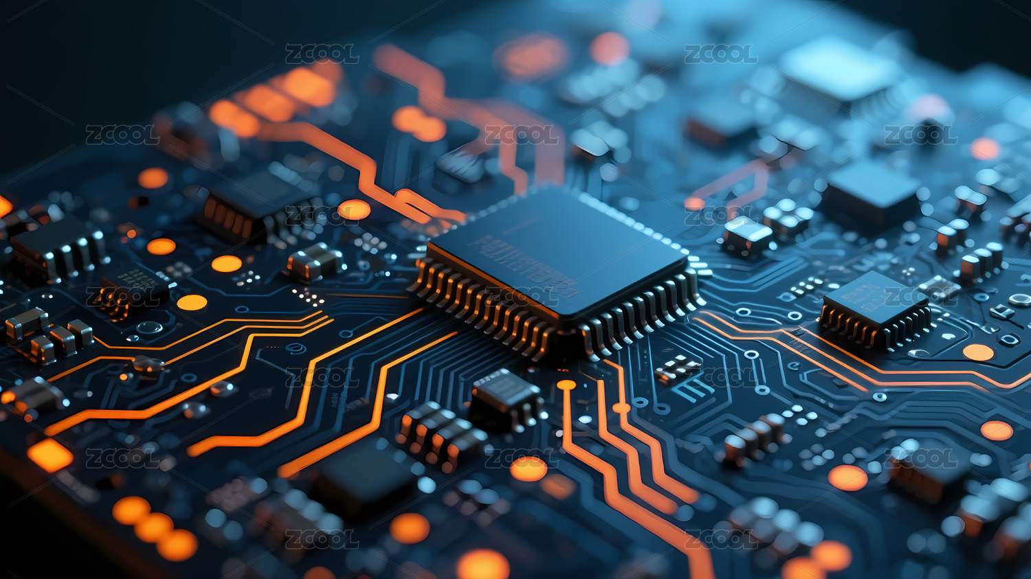 电路板,电子,元件,线路,深蓝,黑色,红色,橙色,蓝色,发光