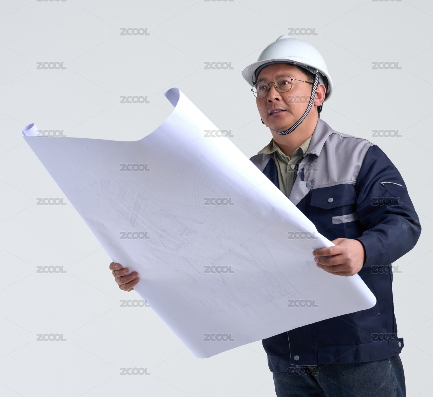 头戴黄色安全帽的农民工手拿图纸在白背景前