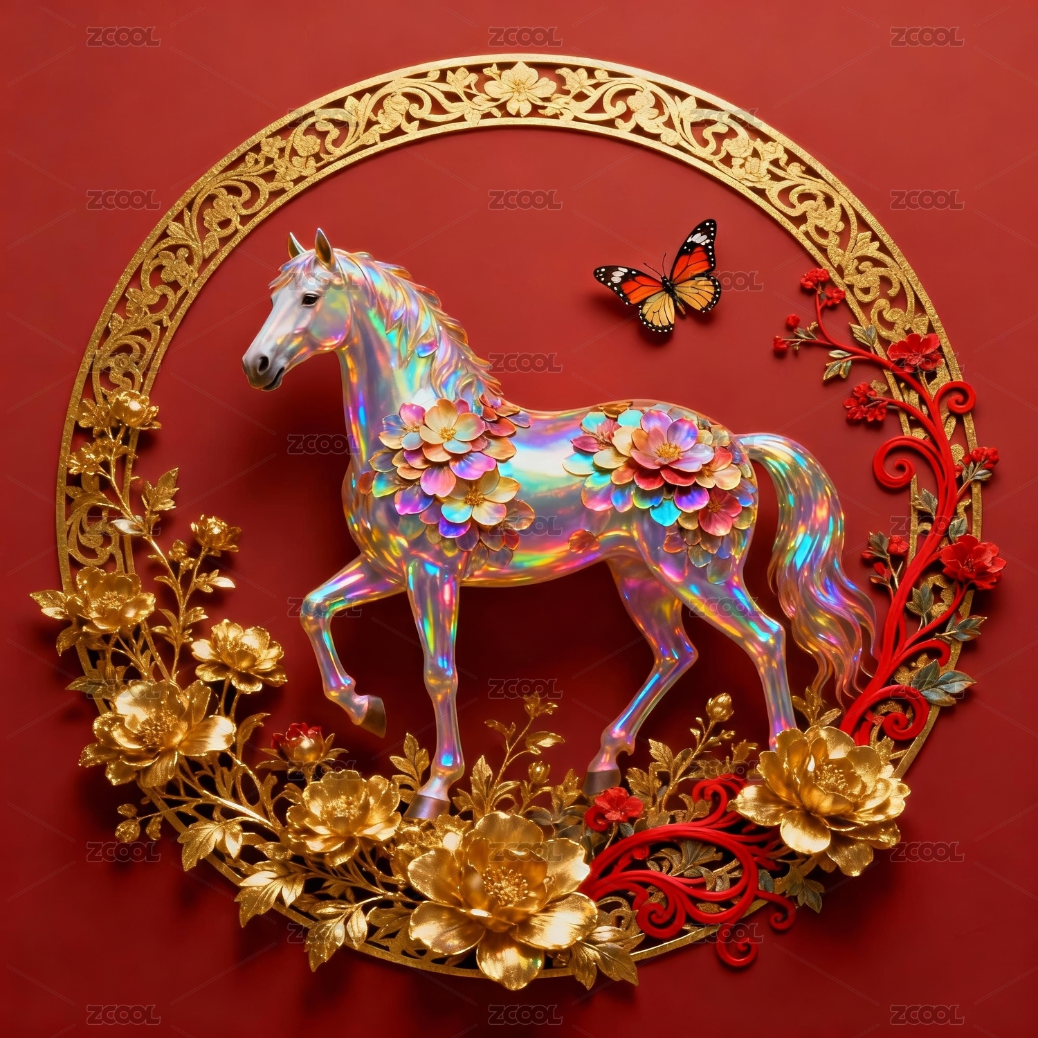 金色浮雕马红底中式喜庆场景