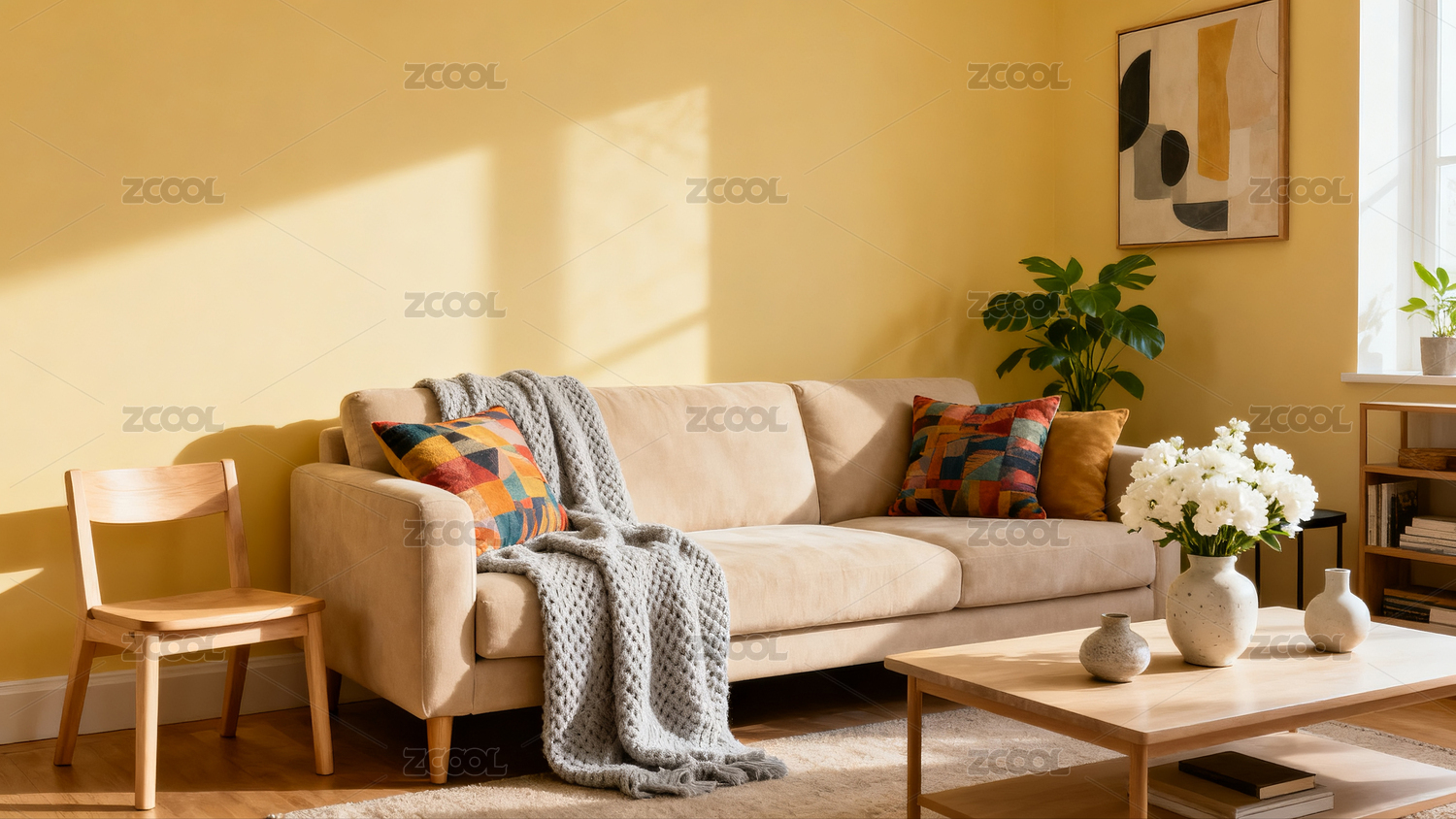 客厅,沙发,阳光,米色,温馨,家居,窗户,台灯,抱枕,茶几