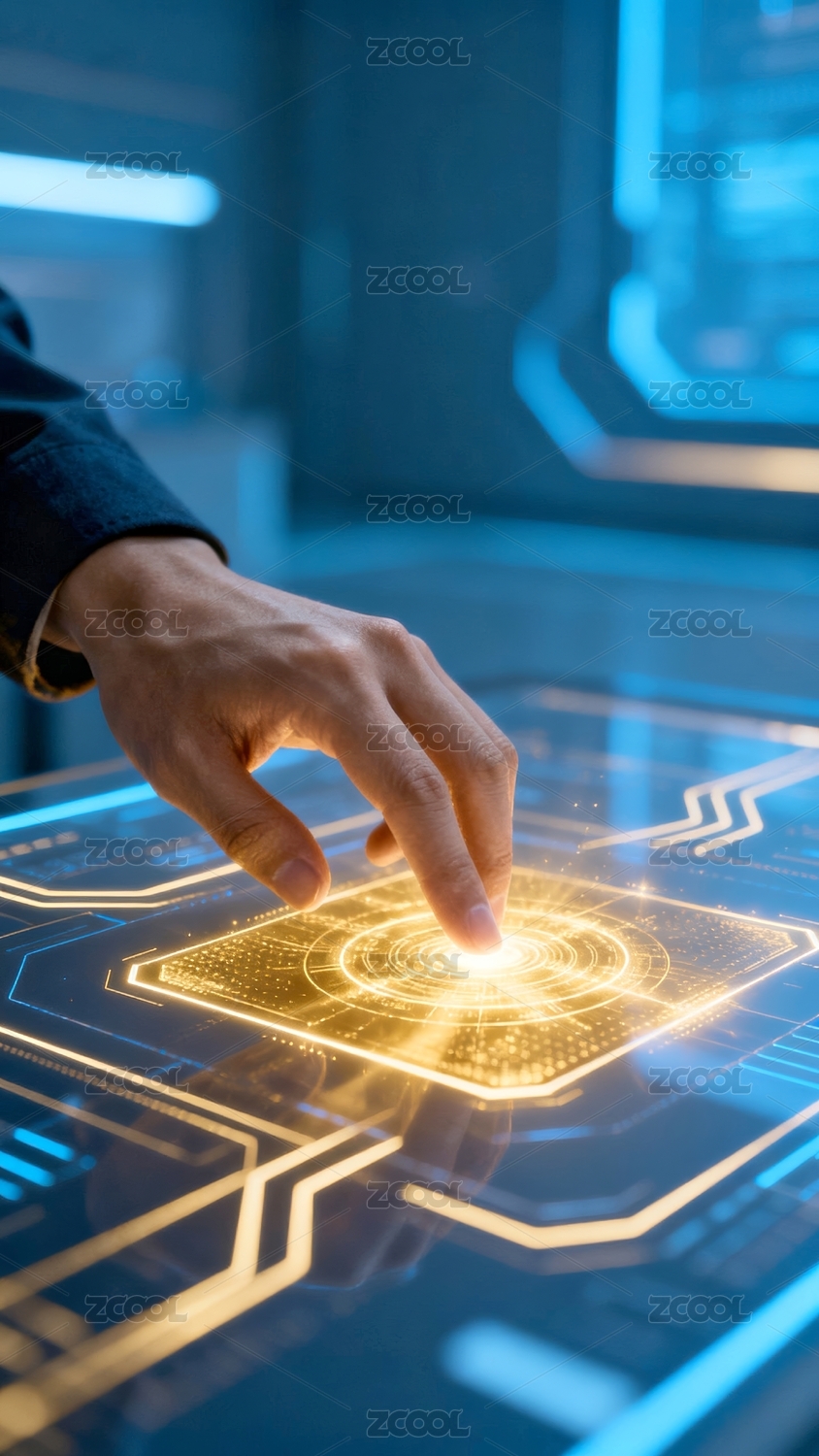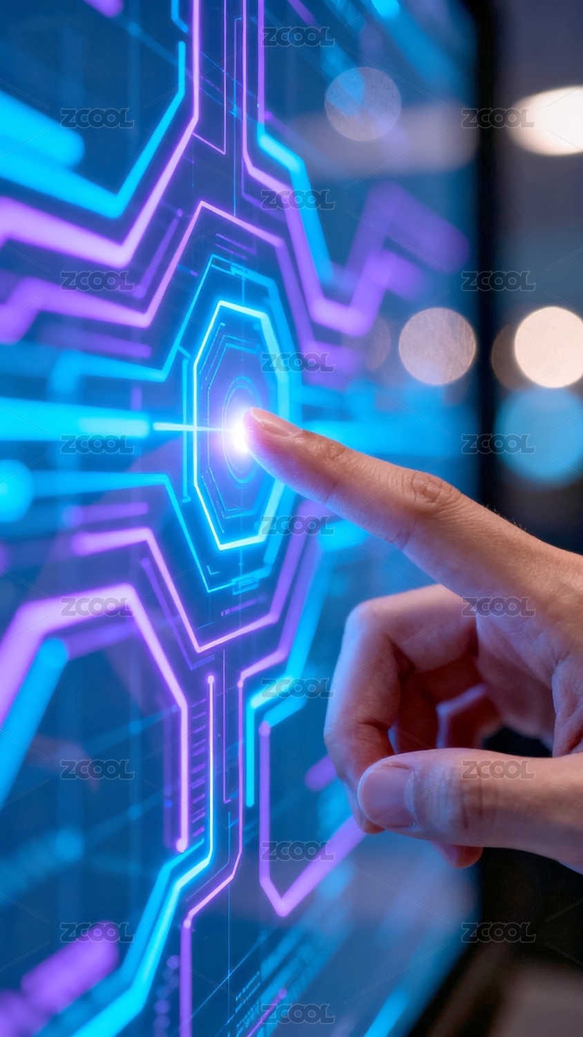 科技背景手指点击蓝色旋转圆圈光线轨迹3D
