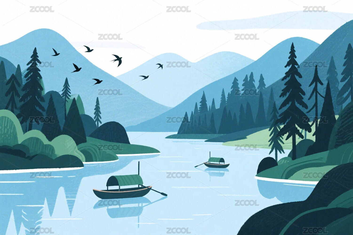 山水湖泊小船插画