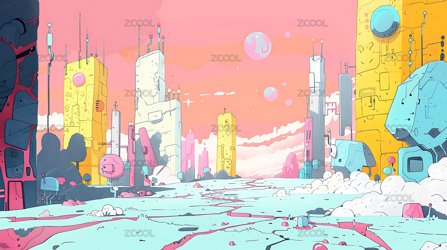 末日,废墟,城市,插画,残垣断壁,废土,科幻,未来,荒凉,手绘