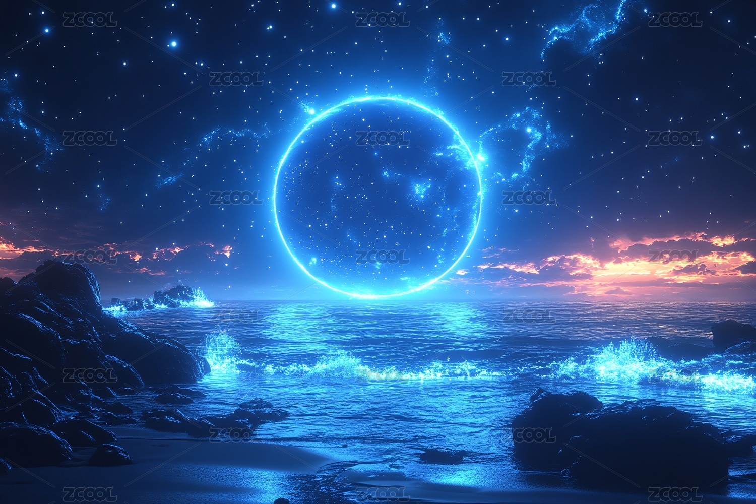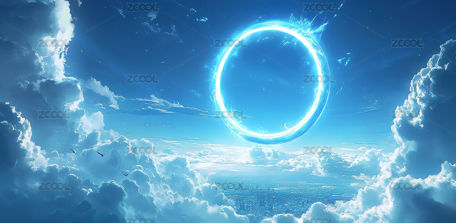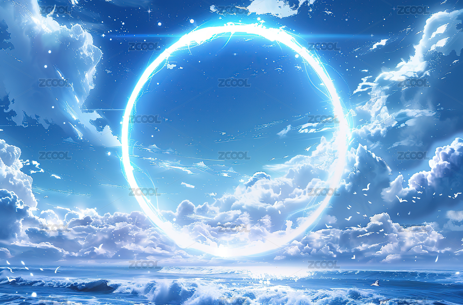 海面,发光,圆环,蓝色云海,神秘,光环,天空,海洋,光影,水天一色